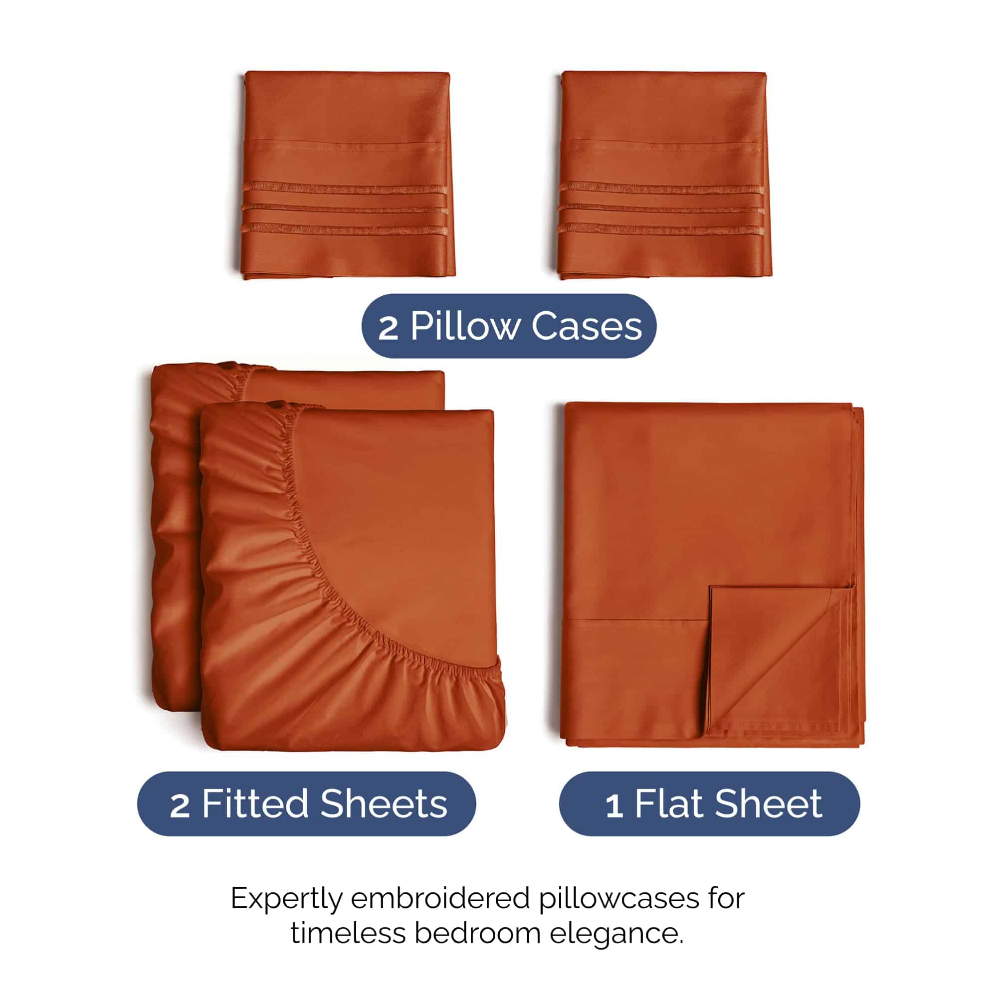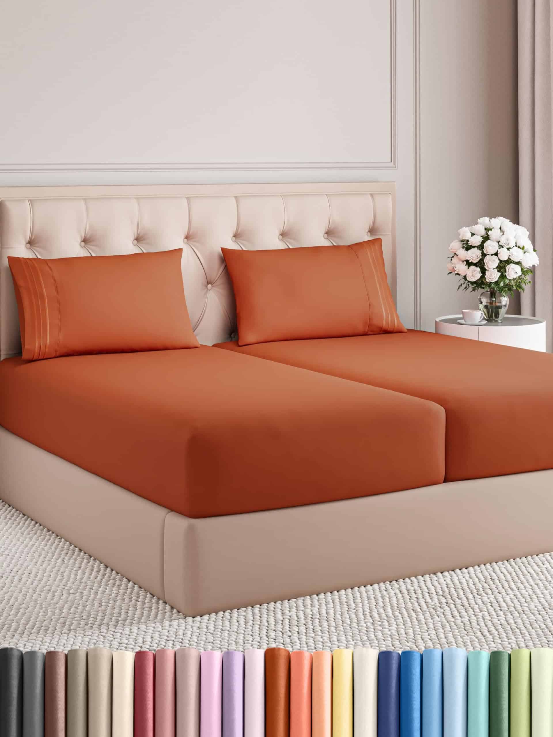 Las sábanas de cama Split King de 5 piezas ofrecen una experiencia de sueño excepcionalmente suave y confortable. Este juego de sábanas incluye 2 fundas de almohada, una sábana plana y 2 sábanas ajustadas, garantizando que su cama esté completamente equipada y lista para darle la bienvenida a un sueño de calidad. La sábana plana tiene unas medidas generosas de 108 pulgadas de ancho por 102 pulgadas de largo, y las sábanas ajustadas tienen unas medidas de 39 pulgadas de ancho por 80 pulgadas de largo, lo que las hace compatibles con colchones de hasta 16 pulgadas de profundidad.