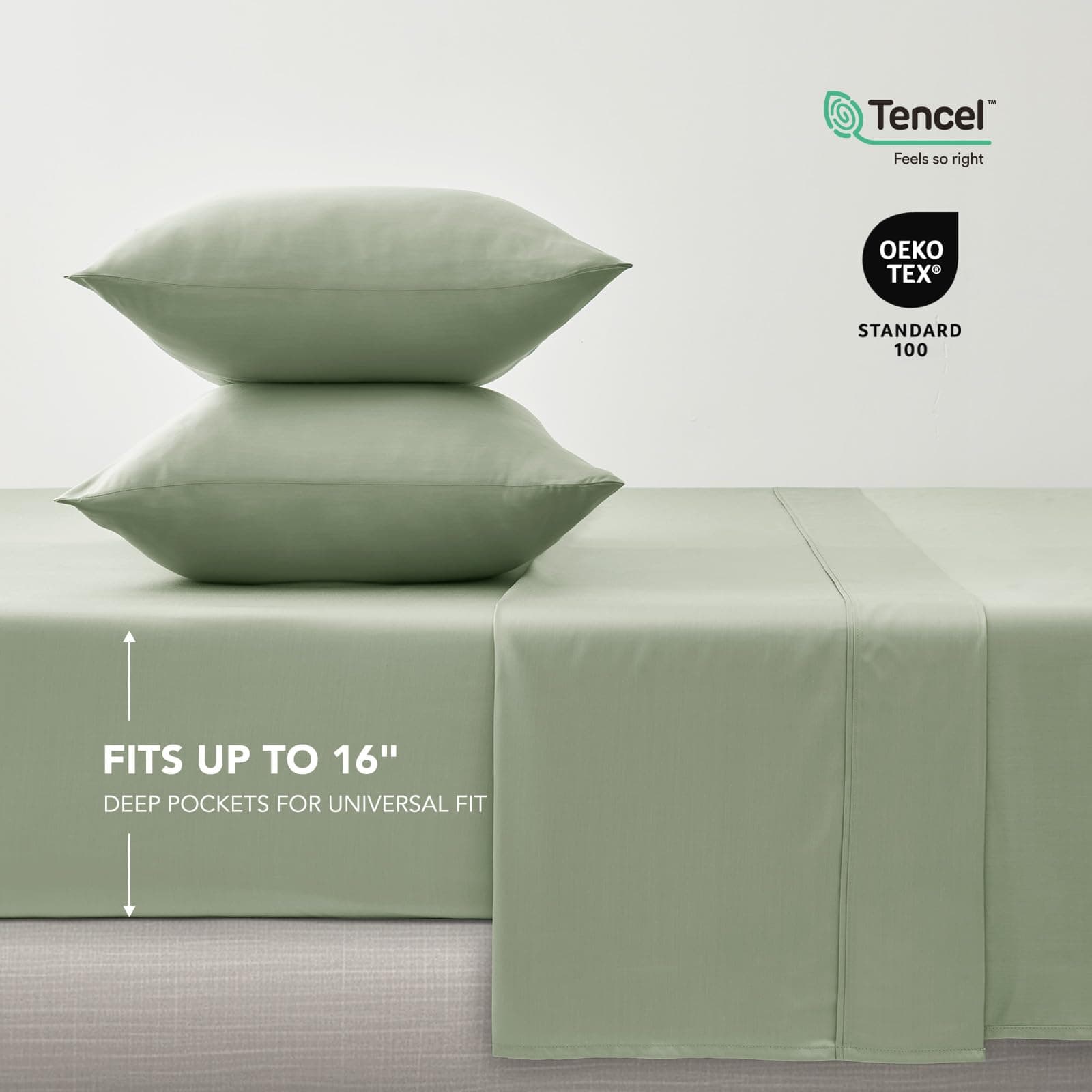 El TENCEL está expertamente tejido para apoyar la regulación térmica natural de tu cuerpo, asegurando una sensación fresca y seca durante toda la noche. La inherente transpirabilidad de la tela y sus propiedades de absorción de la humedad trabajan en armonía para crear un ambiente de sueño cómodamente fresco. Disfruta de la combinación perfecta de transpirabilidad, suavidad y durabilidad para uso durante todo el año y una noche de sueño reparador. Abraza la comodidad consciente con nuestro TENCEL Lyocell producido de manera sostenible: una tela Carbon Zero proveniente de árboles de eucalipto. Se fabrica con un proceso de producción de circuito cerrado respetuoso con el medio ambiente para que cada noche de sueño sea un paso hacia un futuro más verde. Experimenta la combinación perfecta de lujo y sostenibilidad. Nuestro juego de sábanas incluye una sábana plana (102»x90»), una sábana ajustable (80»x60»x16») y dos fundas de almohada (20»x30»). La sábana ajustable, con etiquetas convenientes en el lado corto/largo y un bolsillo profundo que se adapta a colchones de hasta 16 pulgadas, asegura un ajuste de cama sin esfuerzo. Cada detalle garantiza una calidad y lujo duraderos para tu sueño. Lavable a máquina y apto para secadora. Disfruta de sábanas que mantienen su vibrante color, resistiendo la decoloración, encogimiento o formación de bolitas con el tiempo. Disfruta de su suavidad lujosa y colores duraderos que permanecen intactos lavado tras lavado, disfrutando de años de comodidad y lujo incomparables. Date a ti mismo o a un ser querido el regalo definitivo de belleza y ropa de cama fácil de cuidar.