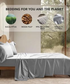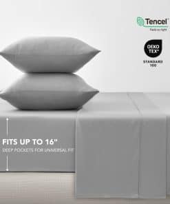 Nuestro juego de sábanas de tencel está diseñado para ofrecer una experiencia de sueño de lujo con comodidad transpirable y fresca. Hecho con 100% fibras de TENCEL Lenzing provenientes de Austria, las sábanas ofrecen una suavidad sedosa y un tacto agradable para la piel. Certificado Oeko-Tex Standard 100, garantizamos que están libres de sustancias nocivas y seguras para toda la familia. La tela TENCEL es conocida por su frescura y capacidad de regular la temperatura corporal de forma natural, manteniéndote cómodo y fresco durante toda la noche. Disfruta de la sensación de dormir envuelto en un lujo sostenible con nuestro Lyocell TENCEL de origen eco-consciente. Cada noche de descanso se convierte en un paso hacia un futuro más verde. El juego de sábanas incluye una sábana plana generosamente dimensionada, una sábana ajustable que se adapta a colchones de hasta 16 pulgadas de grosor y dos fundas para almohada a juego. Con detalles considerados como etiquetas convenientes en los lados corto y largo de la sábana ajustable y un bolsillo profundo para colchones más gruesos, nuestro objetivo es garantizar un ajuste perfecto de la cama y una experiencia de sueño inigualable. No te preocupes por el mantenimiento de estas sábanas de tencel de alta calidad. Son lavables a máquina y aptas para secadora, lo que garantiza que mantengan su suavidad y colores vibrantes lavado tras lavado. Olvídate de la decoloración, el encogimiento o las bolitas y disfruta de años de confort y lujo duraderos. Trata a ti mismo o a un ser querido con este juego de ropa de cama de fácil cuidado y belleza incomparable.