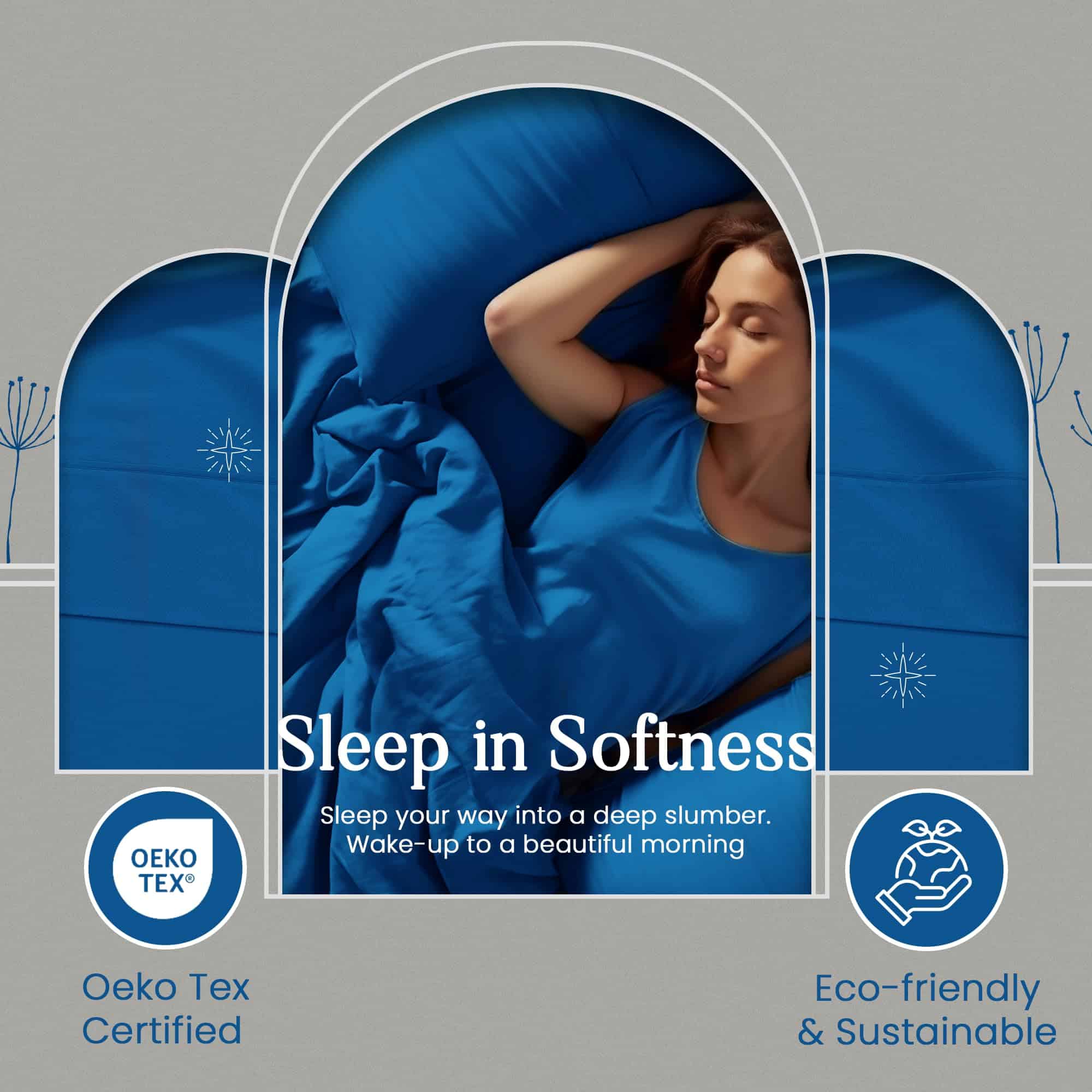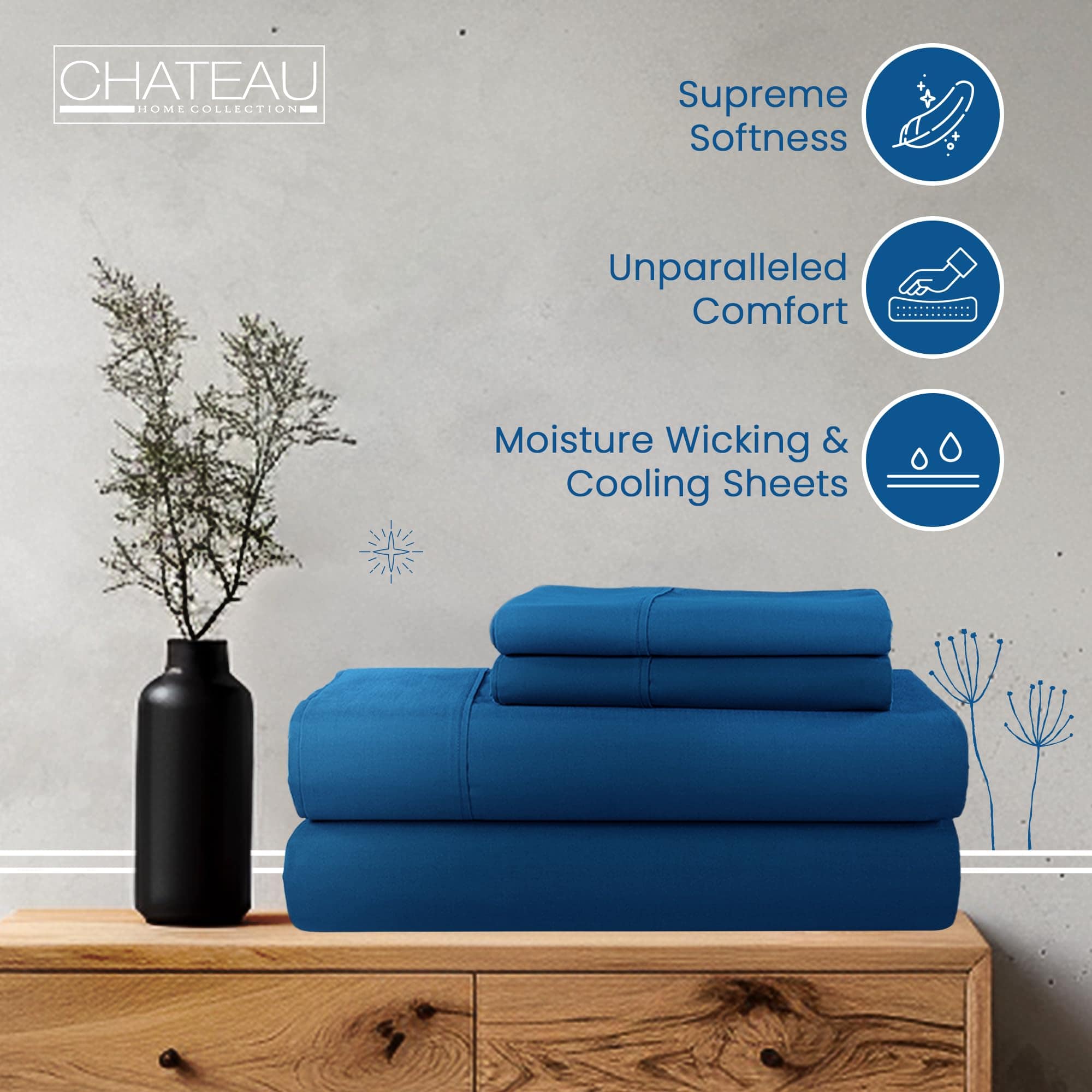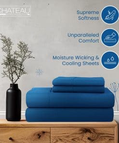 Renueva tu habitación con este lujoso juego de sábanas de Tencel y algodón de la colección CHATEAU HOME. Estas sábanas suaves y transpirables tienen un conteo de 300 hilos y vienen en un hermoso color Azul Francés. Certificadas Oeko-TEX para tu tranquilidad. Perfectas para camas tamaño California King con colchones de hasta 17 pulgadas. Disfruta de la frescura y la comodidad que te proporcionarán estas sábanas de alta calidad.