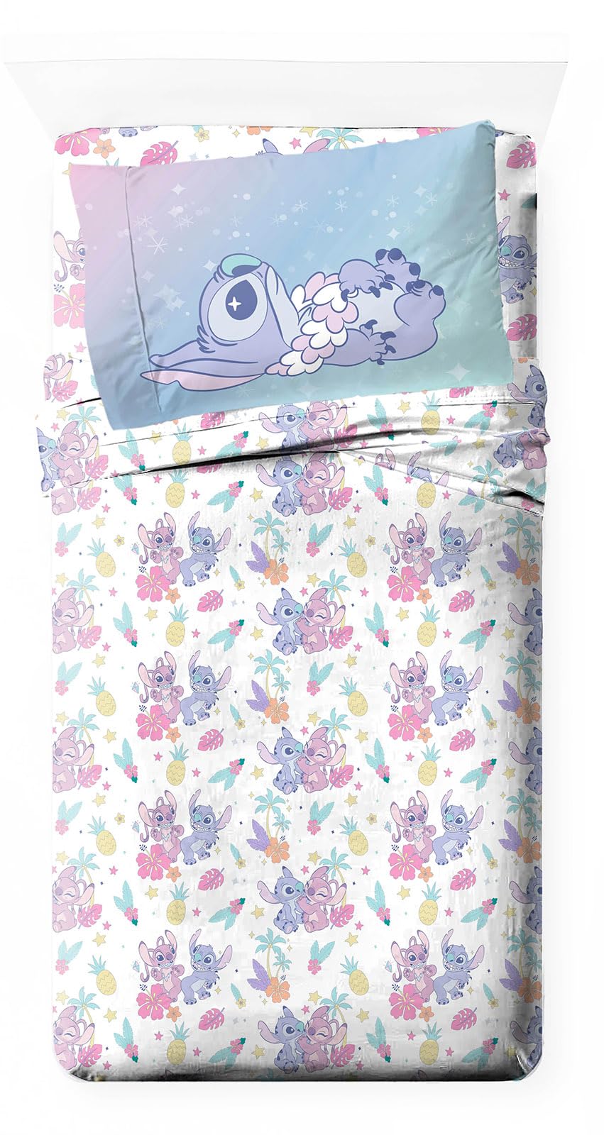 Este juego de sábanas Disney Lilo y Stitch Twin Size es perfecto para cualquier fan de esta película clásica de Disney. Con un diseño encantador que presenta a Stitch y Angel, seguramente traerá diversión y color a la habitación de tu hijo. El juego incluye una sábana ajustable, una sábana plana y una funda de almohada estándar, todo hecho con material de microfibra cepillada que es súper suave al tacto y perfecto para mantener a tu pequeño cómodo durante toda la noche.