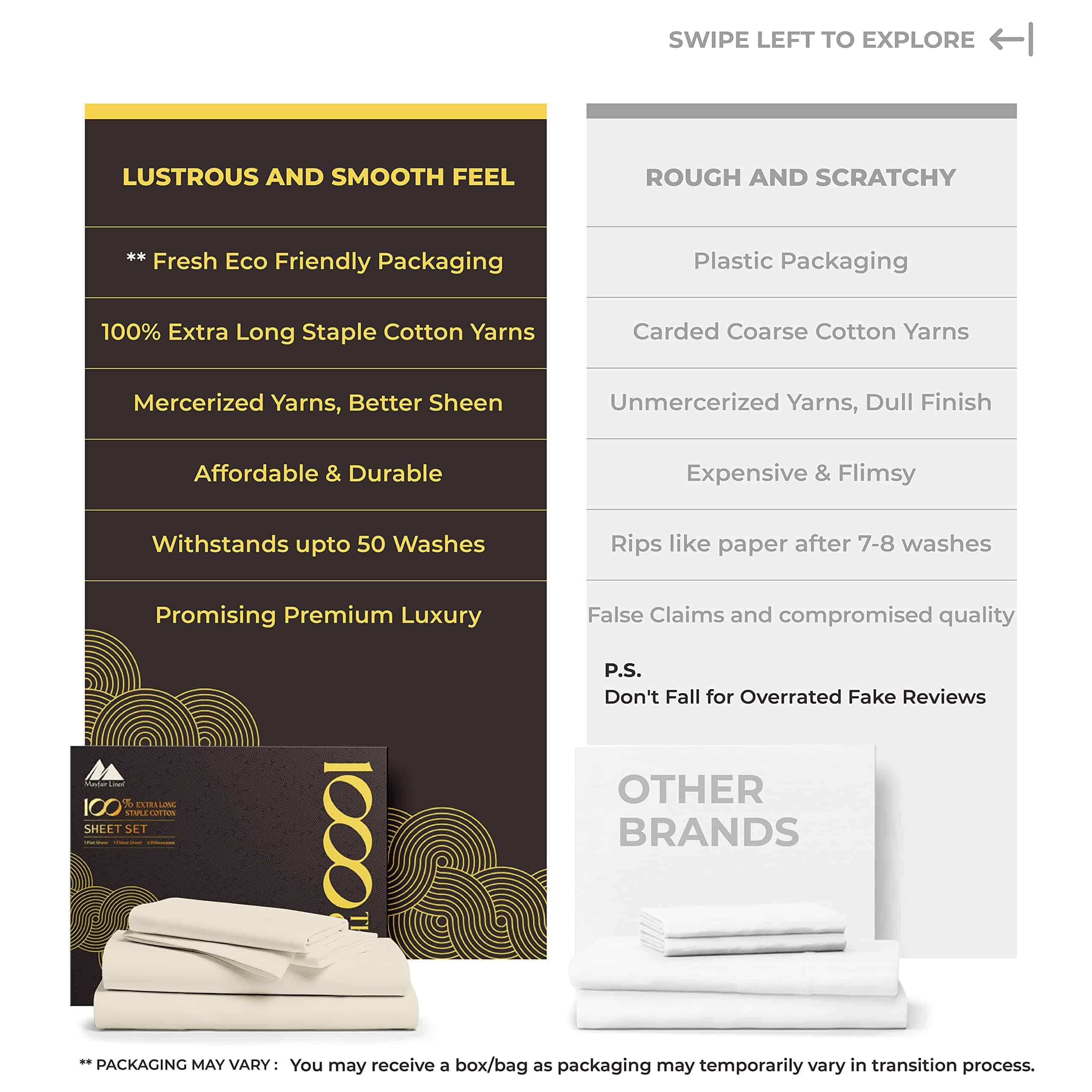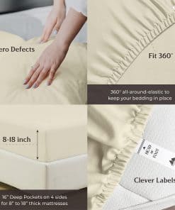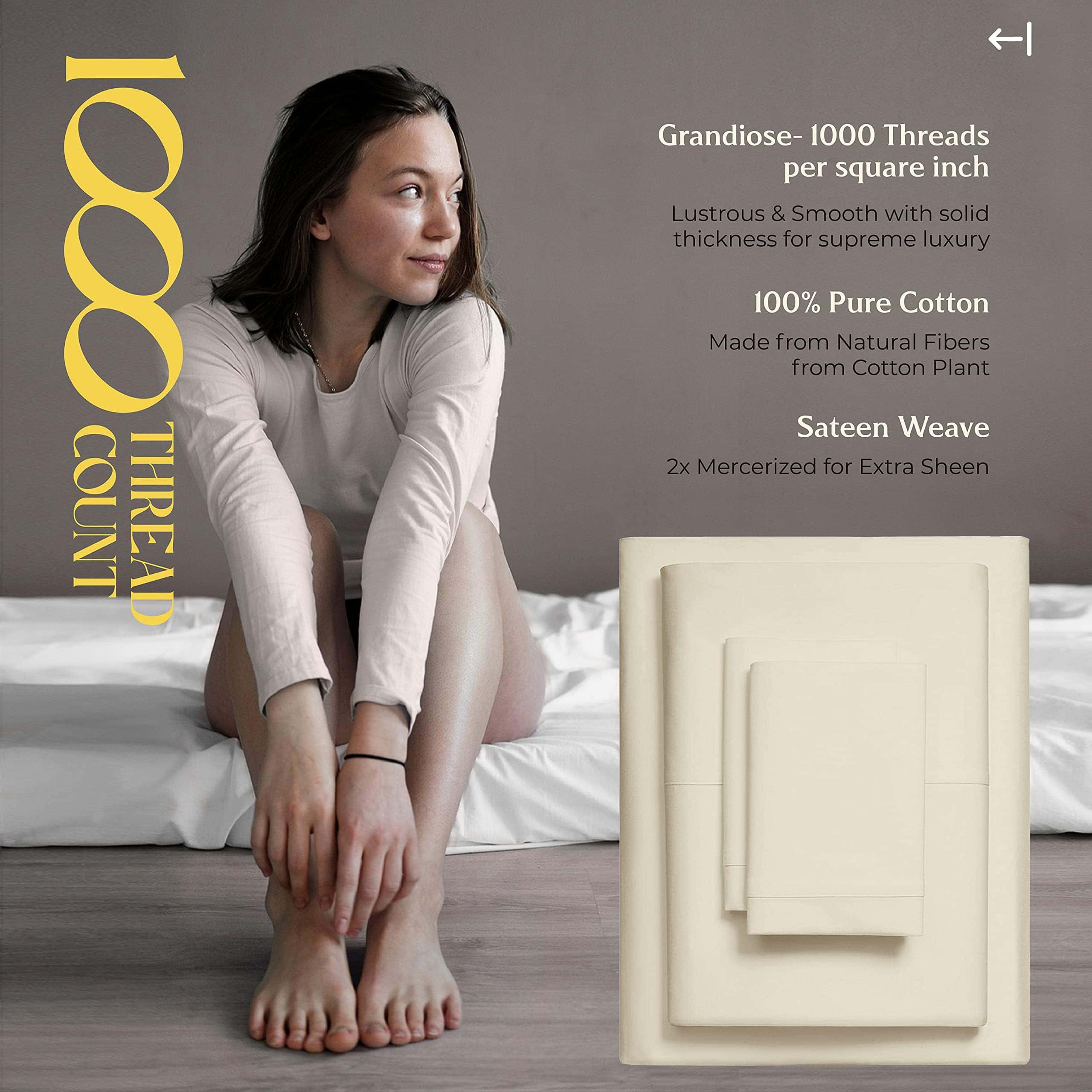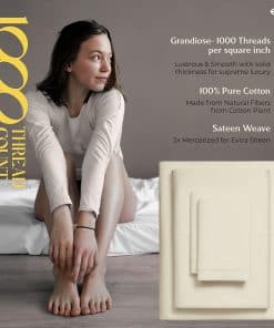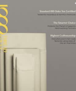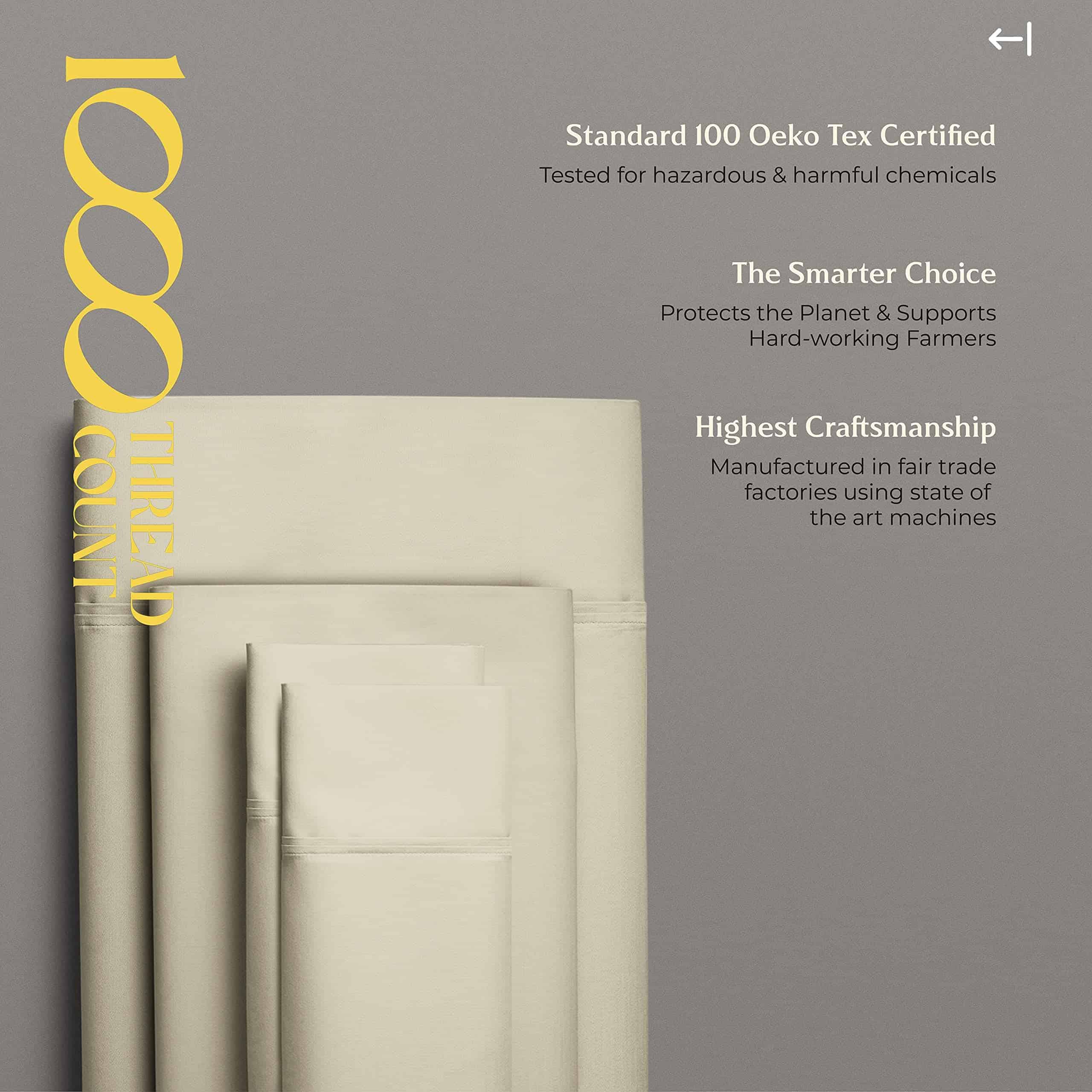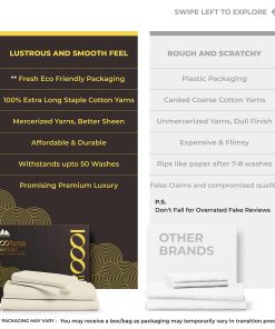 QUÉ HAY EN EL BOLSA 1 Sábana plana – 108 W x 102 L (274 cm x 259 cm) | 2 Sábanas inferiores – 39 W x 80 L + 16 bolsillo profundo (99 cm x 203 cm + 41 cm) | 2 Fundas de almohada en tamaño King – 21 W x 41 L (53 cm x 104 cm) QUÉ HACE QUE NUESTRAS SÁBANAS SEAN LAS MÁS SUAVES Y LUJOSAS EN EL MERCADO ACTUAL: Cuanto más larga sea la fibra, más suave será la tela. Usamos fibras de algodón de fibra extralarga para hacer los juegos de sábanas más suaves y acogedores. 1000 hilos se tejen en cada pulgada cuadrada de tela para mejorar la resistencia, la resistencia al pilling y al encogimiento, y la suavidad de la tela. Las sábanas luego se mercerizan para un toque más suave, un mayor lustre y para que los colores luzcan más brillantes que las sábanas de algodón regulares. ¿SON COMPARABLES A LA ROPA DE CAMA DE HOTEL DE CINCO ESTRELLAS: Sí. El tejido satén proporciona un tacto suave y sedoso que se siente similar a la textura de las sábanas de cama de hotel de cinco estrellas. Estas sábanas de algodón son suaves, frescas y transpirables, como las que descansas en un hotel de cinco estrellas. ¿SON ESTAS SÁBANAS MÁS DURADERAS QUE OTRAS SÁBANAS DE ALGODÓN: Puedes decirlo. Las sábanas hechas de algodón de fibra extralarga tienden a desgastarse menos, a hacer menos pelusa, a arrugarse menos para durar más que otras sábanas de algodón, sábanas de microfibra y sábanas de poliéster. ¿CÓMO HACEMOS SÁBANAS QUE SE AJUSTEN PERFECTAMENTE A TU CAMA: Cada sábana inferior tiene elástico completo y bolsillos profundos para adaptarse a todos los colchones de hasta 18 pulgadas de profundidad. Las etiquetas inteligentes indican el lado de la longitud y el ancho para que puedas hacer la cama fácilmente. Las fundas de almohada tienen cierres de sobre para que las almohadas queden dentro de la funda. Como puedes ver, hicimos todo el trabajo aquí para que no tengas que hacerlo. ¿POR QUÉ MÁS DE 1M DE CLIENTES NOS CONFIAN: Cada paso de nuestro proceso es sostenible y ético para todos. Esto significa que nuestro juego de sábanas de algodón se cultiva de forma natural. Somos certificados por STANDARD 100 by OEKO-TEX, lo que significa que nuestra ropa de cama no contiene sustancias dañinas. Por último, todo nuestro embalaje es libre de plástico, lo que nos convierte en una opción amigable y sostenible