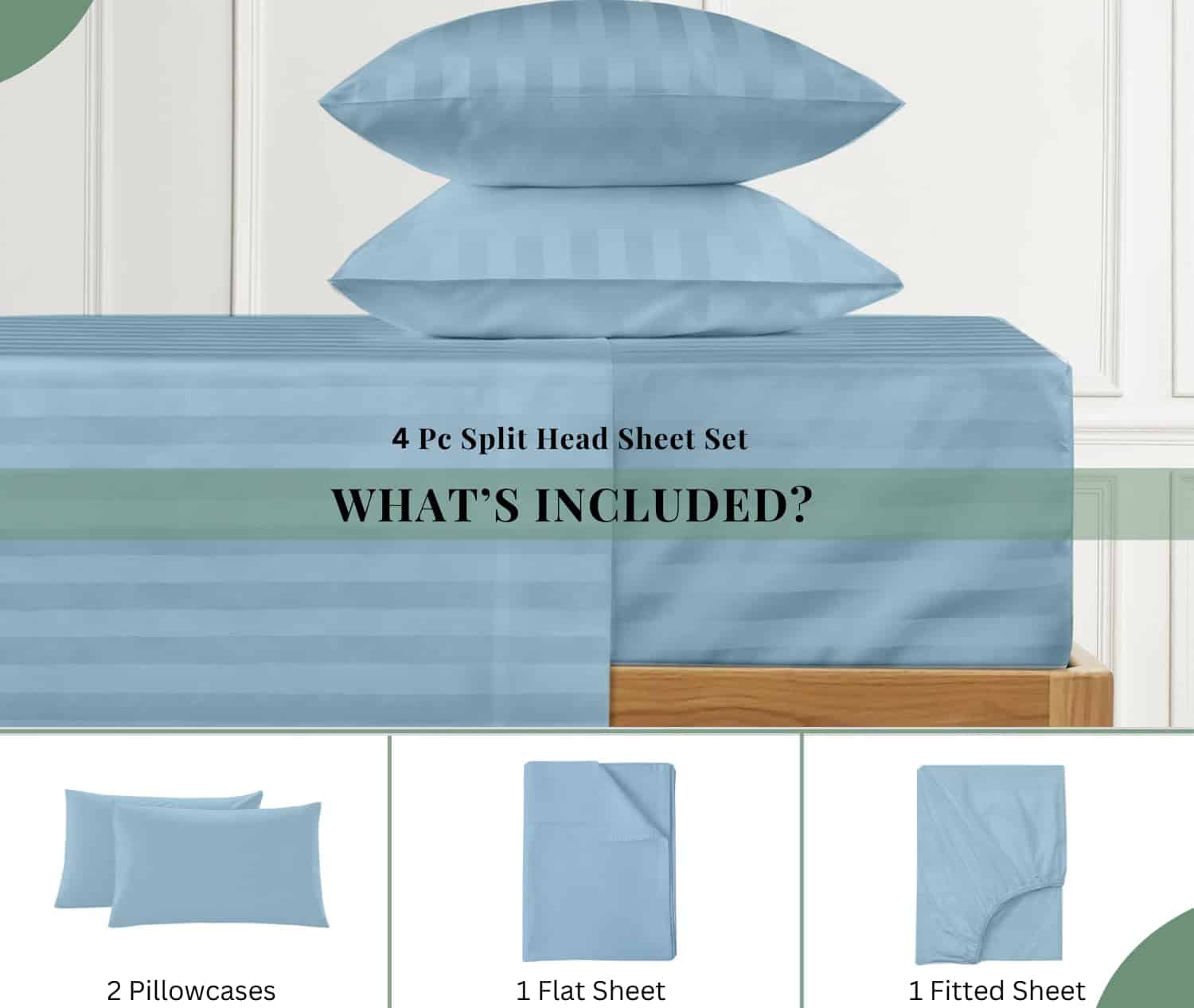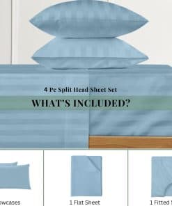 1. Juego de sábanas ajustables de algodón para cama King dividida arriba Incluye: Una sábana plana mide 102 pulgadas de ancho x 108 pulgadas de largo, una sábana ajustable superior dividida de 78 pulgadas de ancho x 80 pulgadas de largo con 6 bolsillos en las esquinas para adaptarse a un colchón de bolsillo profundo de 18 pulgadas y dos fundas de almohada King que miden 20 pulgadas de ancho x 40 pulgadas de largo cada una. 2. Juego de sábanas ajustables superiores King divididas: divididas en 34 pulgadas desde la parte superior. 3. Información del material: Juego de sábanas para la cabeza superio divida 100% algodón egipcio ofrece una codiciada combinación de fuerza superior, suavidad lujosa y hermoso brillo. Este juego de sábanas está hecho de puro algodón 100%. 4. Garantía de satisfacción del 100%: Nos comprometemos a asegurarnos de que ames tus nuevos textiles y tengas una experiencia excepcional. Juego de sábanas que transforma un dormitorio en un oasis, queremos que ames cada noche en nuestras sábanas de alta calidad. Dale el regalo definitivo o date un capricho. ORDENA AHORA, sin riesgos. Si no estás completamente satisfecho, avísanos y lo arreglaremos. 5. Instrucciones de cuidado: Lavable a máquina con agua fría, ciclo delicado con detergente suave. Sin lejía, Secar este juego de sábanas con ajuste bajo.