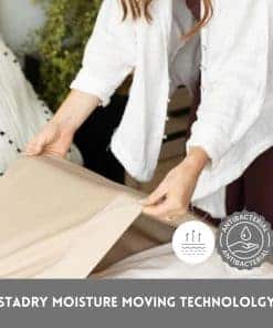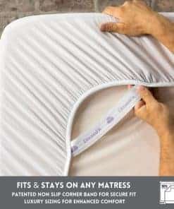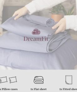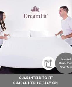 Juego de sábanas DreamFit DreamComfort con tecnología StaDry Cooling y esquinas elásticas para colchones extra profundos de hasta 20 pulgadas. Nuestra tecnología StaDry de microfibra cuenta con un sistema que captura, mueve y libera activamente la humedad corporal para una experiencia de sueño más seca y saludable. Su rendimiento es 3 veces más rápido que el de otros tejidos. Las bandas patentadas DreamFlexTM antideslizantes están cosidas de forma segura en cada esquina de la sábana ajustable, la correa elástica resistente garantiza un ajuste seguro. Las correas tienen 1.5 pulgadas de grosor y son 20 veces más fuertes que el estándar de la industria. Las bandas de esquina codificadas por colores le ayudarán fácilmente a identificar la cabecera y los pies de la sábana. Las sábanas están hechas con una fibra sostenible elaborada a partir de botellas de agua recicladas. Creamos un material único que tiene una sensación ultra suave, es resistente a las arrugas y fácil de lavar mientras minimiza el impacto ambiental. Diseñadas con un tamaño de lujo para adaptarse a los colchones más gruesos y conformes de hoy en día. Nuestras sábanas están dimensionadas de manera que la sábana ajustable permite que la conformabilidad de su colchón se manifieste y se convierta en una excelente opción para camas ajustables. El tamaño de lujo también permite que la sábana ajustable se ajuste a las esquinas del colchón con facilidad. La sábana ajustable se adapta a cualquier colchón de hasta 20 pulgadas de altura. El juego de sábanas de 4 piezas incluye una sábana ajustable patentada, una sábana plana extra grande y dos fundas de almohada estándar.