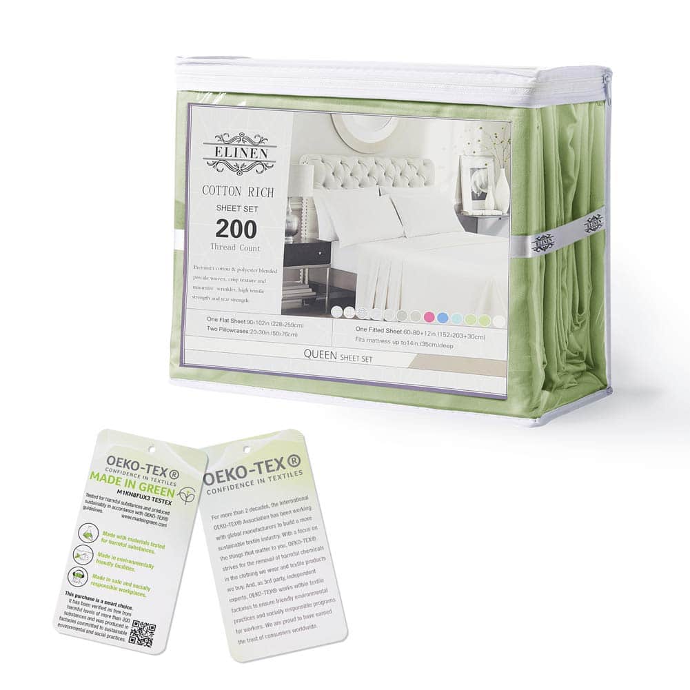 1. Material de alta calidad seleccionado: las sábanas de algodón rico tienen buena resistencia al desgaste en condiciones húmedas y secas. Son estables en tamaño, tienen una pequeña tasa de contracción, son básicamente no deformables, rectas y sin arrugas. Fáciles de limpiar, características de secado rápido. Ligeramente más duras, ligeramente frescas, sensación crujiente y refrescante. 2. Contenido del paquete: El juego de sábanas para cama Queen de 4 piezas incluye una sábana plana: 90×102 + 4 pulgadas, una sábana ajustable: 60×80 + 12 pulgadas, se ajusta a colchones de hasta 14 pulgadas de profundidad con elástico en todo el contorno de la sábana ajustable, dos fundas de almohada: 20×30 + 4 pulgadas. 3. Excelente calidad: Todos los productos siguen las normas ISO y tienen la etiqueta MADE IN GREEN, MADE IN GREEN de OEKO-TEX es una etiqueta para el consumidor rastreable para productos fabricados con materiales probados en sustancias nocivas, fabricados en instalaciones respetuosas con el medio ambiente y en lugares de trabajo seguros y socialmente responsables. Siguiendo los mejores procesos y estándares de calidad internacionales, estas hermosas sábanas son AMIGABLES CON LA PIEL, hipoalergénicas y están hechas para durar mucho tiempo. 4. Sensación lujosa: Sábanas frescas para el verano, siente la diferencia – duerme mejor y despierta cada mañana sintiéndote fresco y lleno de energía. Transpirables, exquisitas y antiarrugas, especialmente tejidas con percal ultrafino rico en algodón para una comodidad suprema que puedes encontrar en sábanas. Lo mejor para cualquier habitación de tu casa – dormitorio, habitación de invitados, habitación infantil, RV, casa de vacaciones. Excelente idea de regalo para hombres y mujeres, mamá y papá, Día de San Valentín, Día de la Madre, Día del Padre y Navidad. 5. Fácil cuidado: con una mano de obra sofisticada, es lavable a máquina, resistente a desvanecerse, encoger y arrugarse. Lavar a máquina en agua fría con colores similares. Planchar caliente cuando sea necesario. Secar a baja temperatura. No usar lejía.
