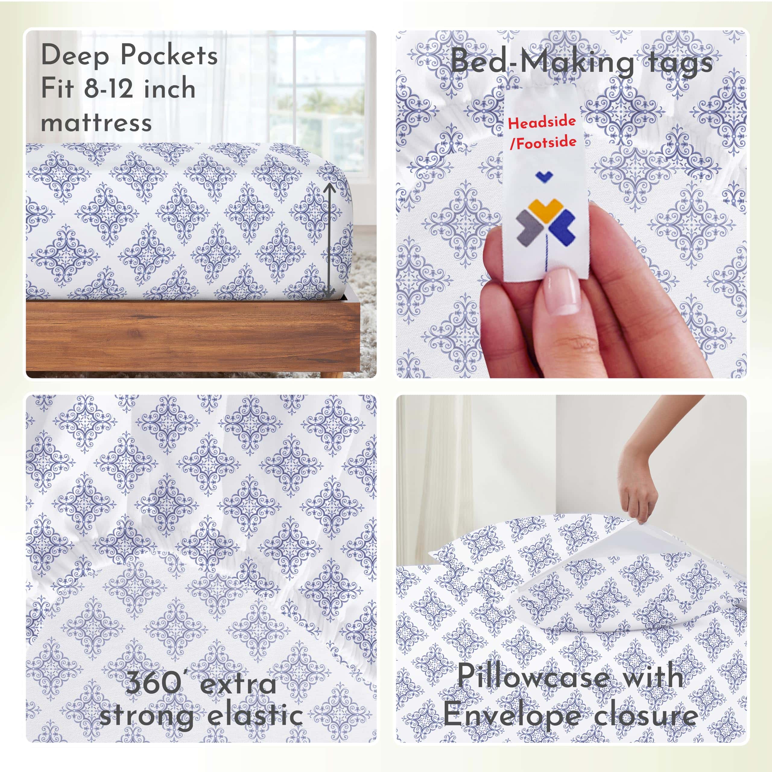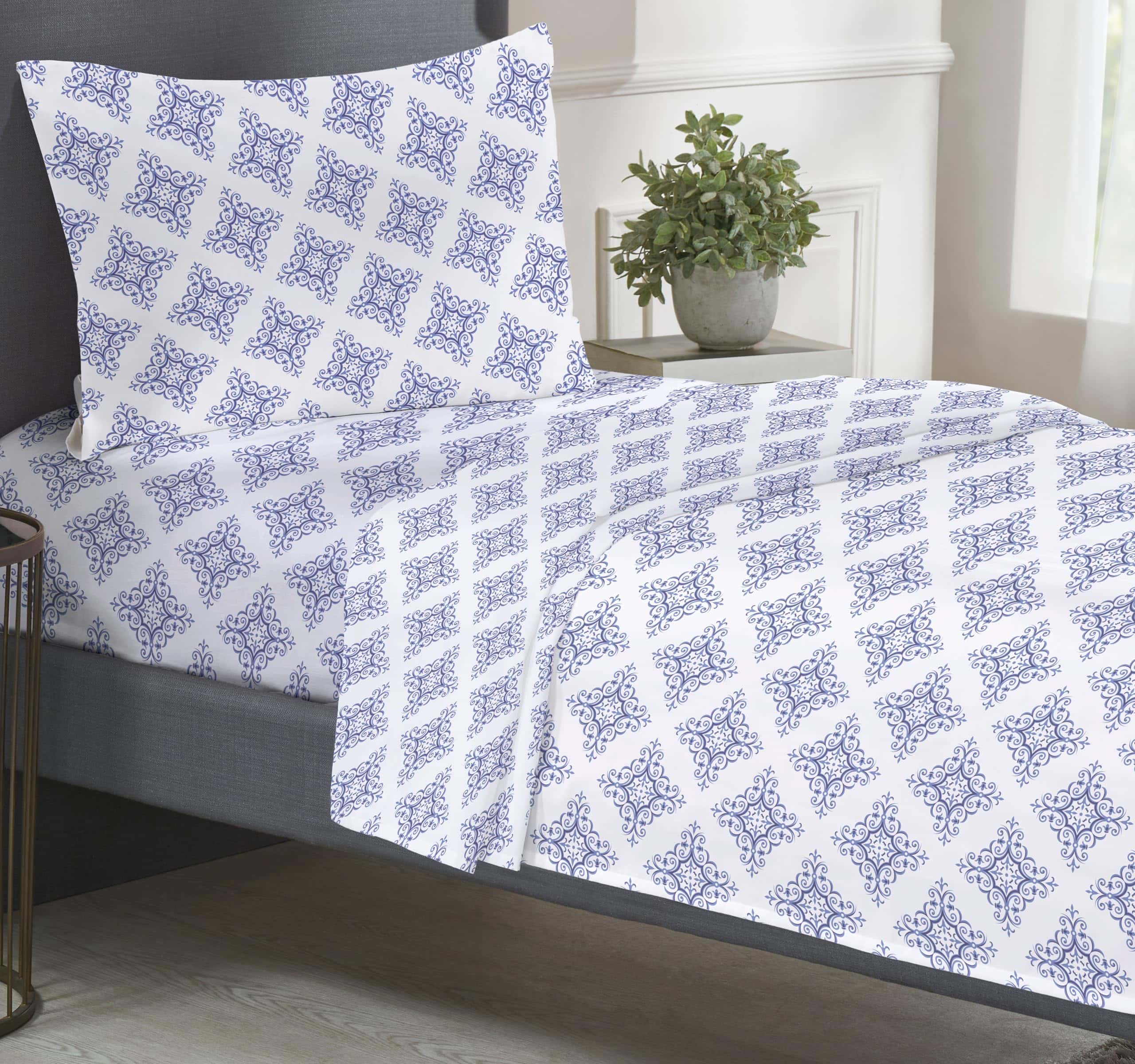 Descubre la mezcla perfecta de estilo y comodidad con nuestros juegos de sábanas estampadas. Si buscas agregar un toque de personalidad a tu ropa de cama, ¡nuestros juegos de sábanas estampadas de sarga de algodón 100% son la solución perfecta! Estas sábanas no solo son increíblemente cómodas, sino que los estampados claros y bien definidos te permiten expresar tu estilo personal de una manera sutil pero impactante. Creemos que la ropa de cama debe ser a la vez elegante y práctica, por eso nuestras sábanas estampadas cumplen con los más altos estándares de calidad y durabilidad. El tejido naturalmente lujoso y suave proporciona un sueño tranquilo y cómodo, mientras que los colores vibrantes y duraderos resisten la decoloración con los lavados. Fabricadas con la mejor calidad de algodón de sarga, nuestros juegos de sábanas estampadas cuentan con una calidad de impresión excepcional. El tejido de sarga crea un lienzo ideal para hermosos estampados equilibrados sin errores de impresión o patrones estridentes. Nuestros juegos de sábanas estampadas de 4 piezas para Queen, King y California King vienen con bolsillos profundos de 14 pulgadas, ajustándose a colchones de 8 a 14 pulgadas de profundidad. Los juegos de sábanas estampadas de 3 piezas para Twin y Twin XL vienen con bolsillos de 12 pulgadas de profundidad, ajustándose a colchones de 8 a 12 pulgadas de profundidad. El elástico fuerte y seguro garantiza que tus sábanas permanezcan en su lugar durante toda la noche, manteniendo su ajuste incluso después de años de uso. Eleva tu ropa de cama con nuestras sábanas estampadas, que cuentan con una variedad de flores y rayas divertidas. Muestra tu personalidad y agrega un toque de color a tu dormitorio con estos elegantes y prácticos juegos de sábanas.