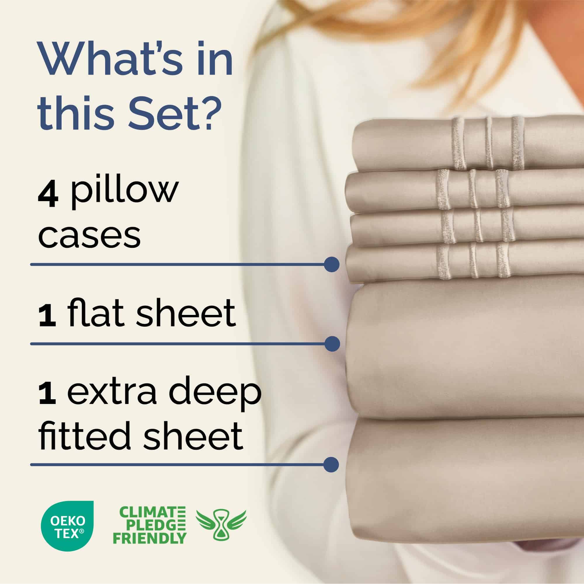 1. SÁBANAS CAL KING EXTRA PROFUNDAS / SÁBANAS ADAPTADAS CALIFORNIA KING EXTRA PROFUNDAS: Estas sábanas son para colchones con bolsillos muy profundos. Se adaptan a cualquier colchón con bolsillos de 18, 20, 21, 22 y 24 pulgadas de profundidad. Hay elástico elástico alrededor de la sábana ajustada extra profunda que se estira para ajustarse perfectamente a su colchón. Perfecto para colchones extra altos y grandes. ¡Tenga la seguridad de que estas sábanas extragrandes se mantendrán apretadas y en su lugar! 2. CONJUNTO DE SÁBANAS DE 6 PIEZAS: Este juego de sábanas incluye un total de 4 fundas de almohada, todas con un hermoso diseño de bordado decorativo en cada funda de almohada. Las fundas de almohada tienen diseños de cierre. Este juego de ropa de cama se adaptará perfectamente a su colchón extra grueso. 3. IDEAL PARA COLCHONES DOBLE TOPE DE ALMOHADA: Estas sábanas son perfectas para colchones con un tope de 3 o 4 pulgadas en la parte superior, toppers de espuma viscoelástica, grandes forros de colchón, toppers de almohada, toppers de espuma, toppers de espuma grandes, colchones con topper y espuma viscoelástica. ¡Estas sábanas no se despegarán! 4. MICROFIBRA: Este es el tipo más suave de sábanas de microfibra que hemos creado. Súper suaves con un tacto ligero. No son crujientes como el algodón. Si estás acostumbrado a las sábanas de algodón y nunca has probado las sábanas de microfibra, te recomendamos que las pruebes. ¡Son aún más suaves que el algodón! 5. DIMENSIONES Y TAMAÑOS: Sábana plana de 117 pulgadas de ancho y 102 pulgadas de largo. Sábana ajustada de 72 pulgadas de ancho y 84 pulgadas de largo con bolsillos de 21 pulgadas (tiene elástico para estirarse). Las cuatro fundas de almohada tienen un tamaño grande de 20 x 40 pulgadas.
