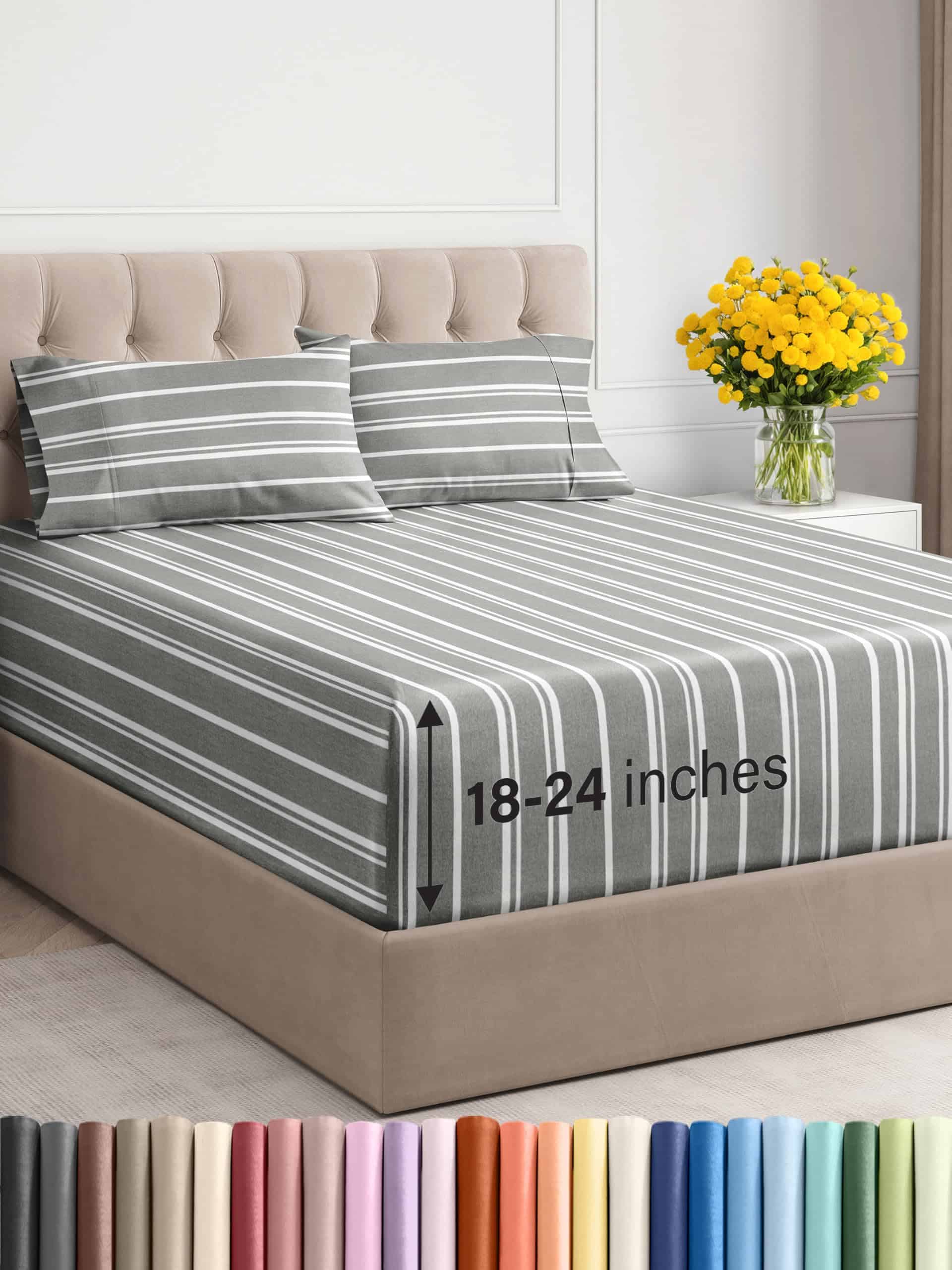 1. JUEGO DE SÁBANAS EXTRA PROFUNDAS / SÁBANAS AJUSTABLES EXTRA PROFUNDAS PARA CAMA INDIVIDUAL: Estas sábanas están diseñadas para colchones con bolsillos muy profundos. Se ajustan a cualquier colchón con bolsillos de 18, 20, 21, 22 y 24 pulgadas de profundidad. Con elástico elástico alrededor de la sábana ajustable extra profunda que se estira para un ajuste perfecto alrededor de su colchón. Perfecto para colchones extra altos y grandes. ¡Con estas sábanas extra grandes, puede estar seguro de que se mantendrán apretadas y en su lugar!