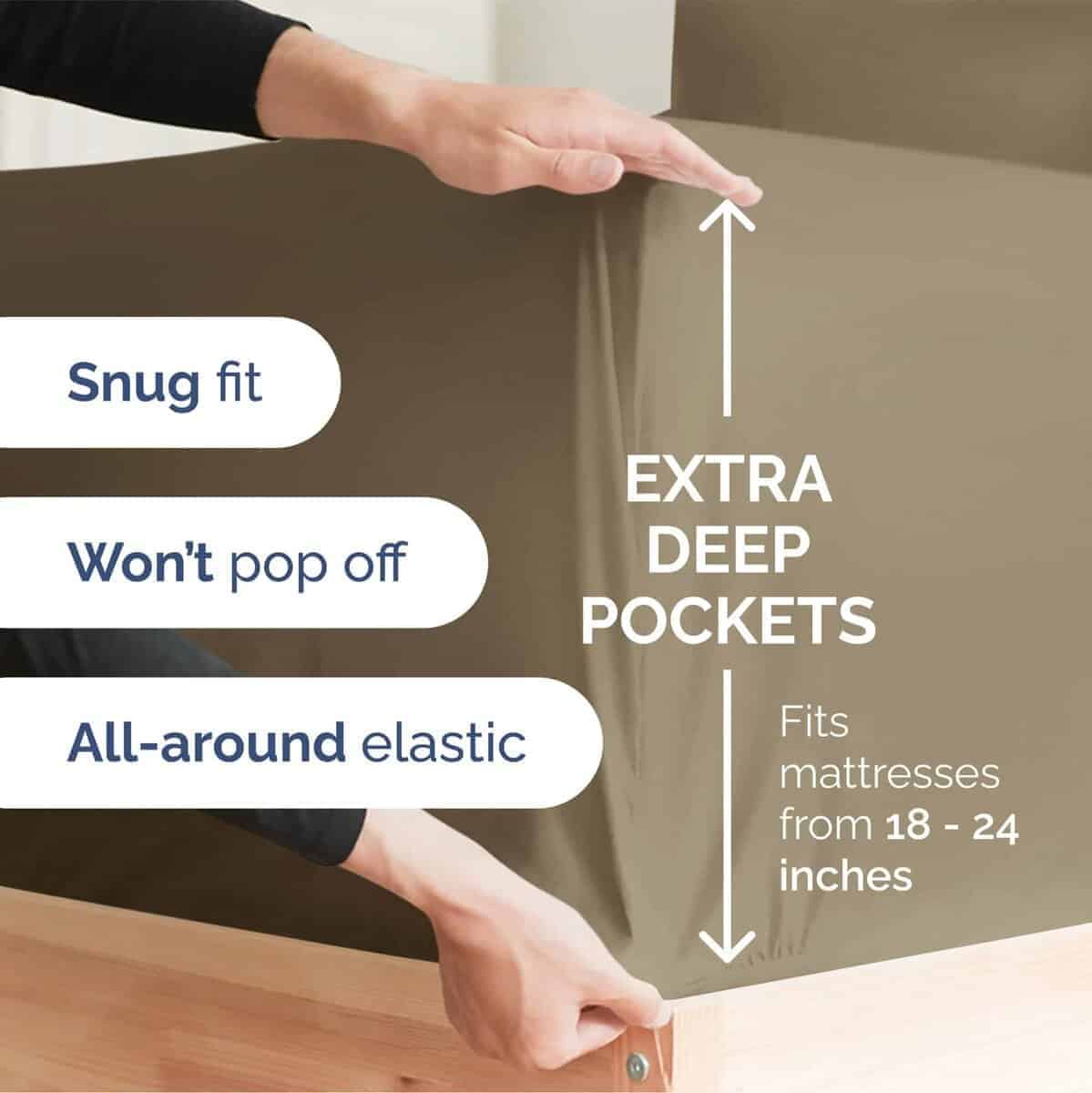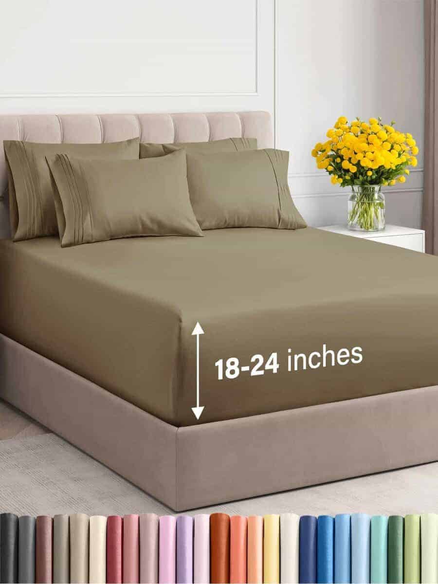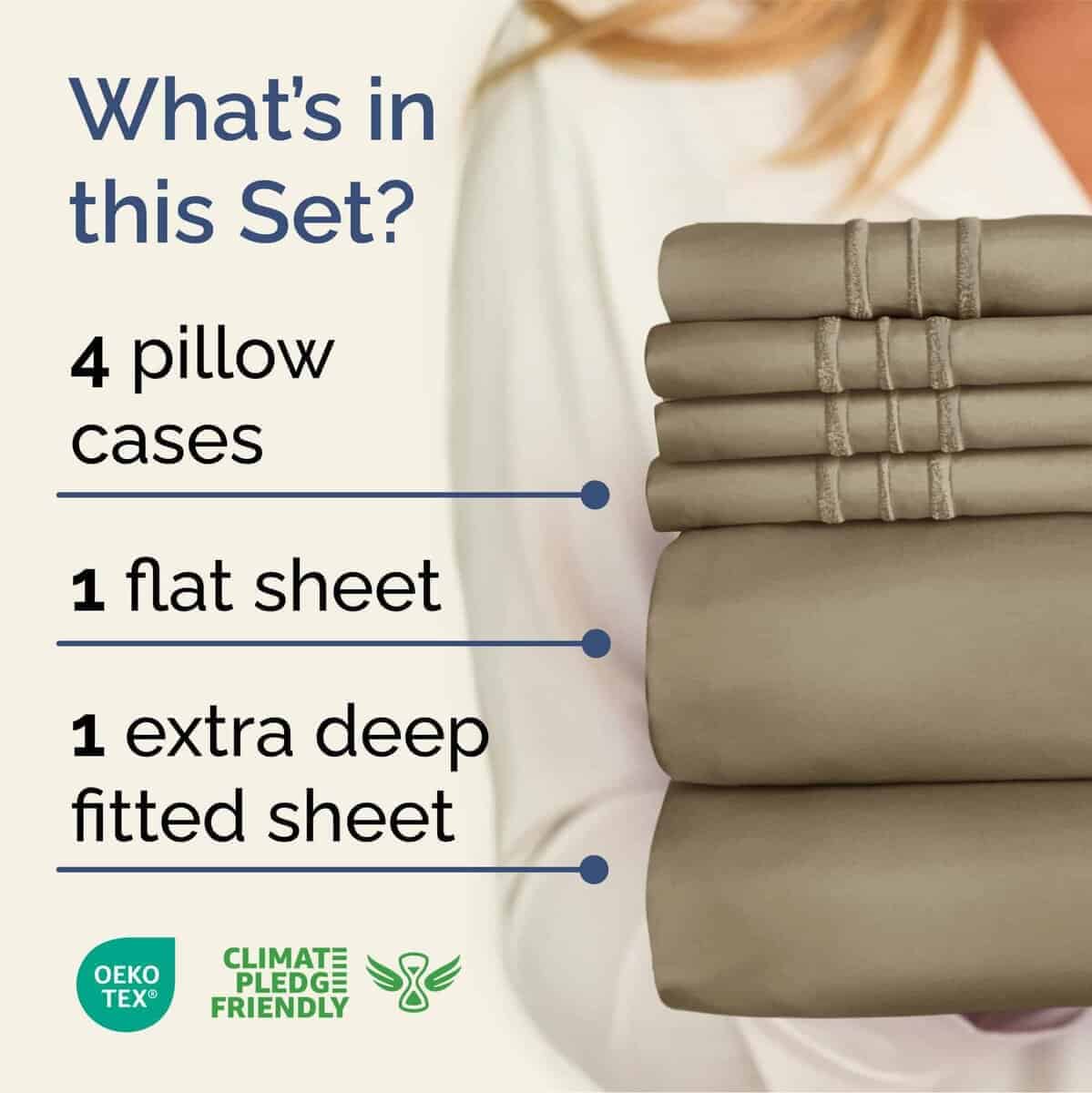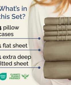 Este juego de sábanas extra profundas para cama Queen incluye un total de 6 piezas con 4 fundas de almohada, todas con un hermoso diseño de bordado decorativo en cada funda de almohada. Las fundas de almohada tienen diseños de cierre. Este juego de ropa de cama se adaptará perfectamente a tu colchón extra grueso. Estas sábanas son perfectas para colchones con un topper de 3 o 4 pulgadas, toppers de espuma viscoelástica, almohadillas de colchón grandes, pillow tops, toppers de espuma, toppers de espuma grandes, colchones con pillow top y espuma viscoelástica. Estas sábanas no se saldrán. Hechas de microfibra, son el tipo de sábanas más suaves que hemos creado. Súper suaves con una sensación ligera. No son crujientes como el algodón. Si estás acostumbrado a las sábanas de algodón y nunca has probado las de microfibra, te recomendamos que lo hagas. ¡Son incluso más suaves que el algodón! Las dimensiones y tamaños incluyen: Sábana plana 95 pulgadas de ancho y 102 pulgadas de largo. Sábana ajustable de 60 pulgadas de ancho y 80 pulgadas de largo con bolsillos de 21 pulgadas (tiene elástico para que pueda estirarse). Todas las cuatro fundas de almohada son extragrandes de 20 x 30 pulgadas.