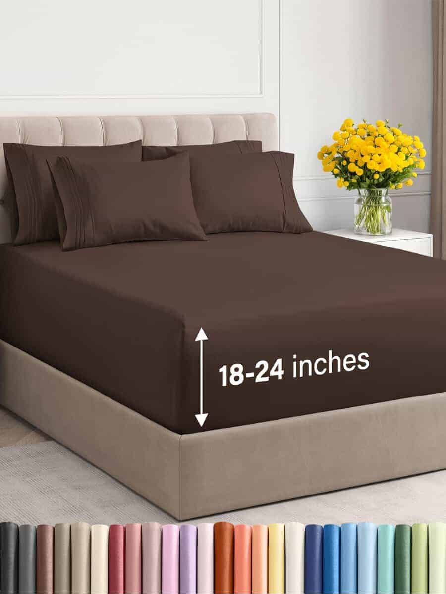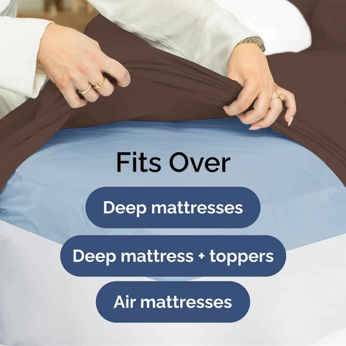 1. JUEGO DE SÁBANAS EXTRA PROFUNDAS / SÁBANAS AJUSTABLES EXTRA PROFUNDAS PARA CAMA QUEEN: Estas sábanas están diseñadas para colchones muy profundos. Se adaptan a cualquier colchón con bolsillos de 18, 20, 21, 22 y 24 pulgadas de profundidad. Hay elástico elástico alrededor de la sábana ajustable extra profunda que se estira para ajustarse perfectamente al colchón. Perfecto para colchones extra altos y grandes. ¡Descansa tranquilo de que estas sábanas extragrandes permanecerán ajustadas y en su lugar!