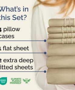 Estas sábanas son las más suaves que hemos creado, hechas de microfibra. Son perfectas para colchones con un topper de 3 o 4 pulgadas, colchones de pillow top, colchones de espuma viscoelástica, entre otros. Las sábanas son de dimensiones generosas y se ajustan a colchones extra gruesos con una elasticidad que asegura que permanezcan en su lugar. Incluye 4 fundas de almohada con diseños de adorno y cierre seguro. Disfruta de la comodidad y calidad de estas sábanas de lujo.
