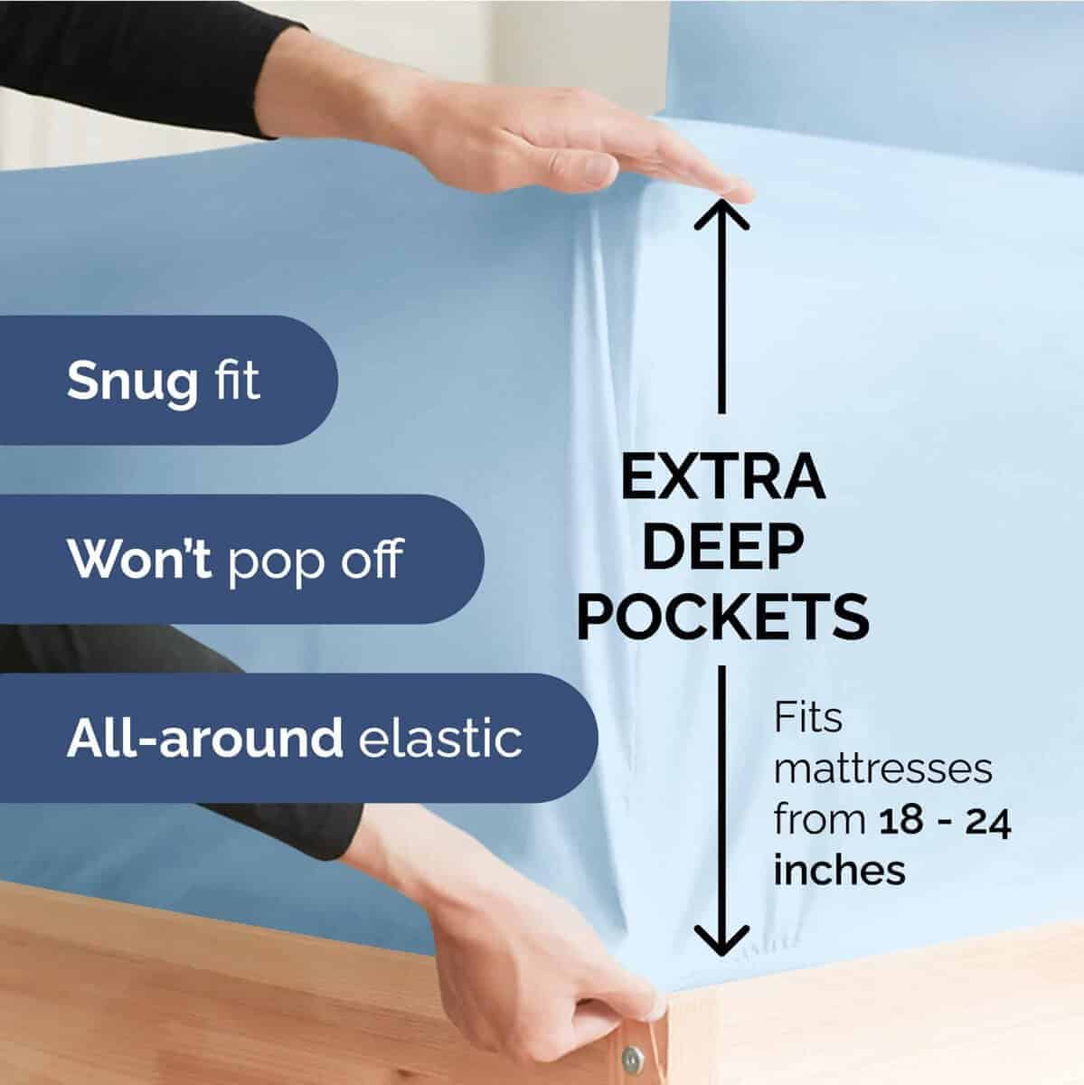 1. JUEGO DE SÁBANAS TWIN XL CON BOLSILLOS EXTRA PROFUNDOS / SÁBANAS AJUSTADAS TWIN XL EXTRA PROFUNDAS: Estas sábanas son para colchones muy profundos. Se ajustan a cualquier colchón con bolsillos de 18, 20, 21, 22 y 24 pulgadas de profundidad. Hay elástico estirable alrededor de la sábana ajustada extra profunda que se estira para un ajuste perfecto alrededor de su colchón. Perfecto para colchones extra altos y grandes. ¡Descanse tranquilo de que estas sábanas extra grandes se mantendrán apretadas y en su lugar!