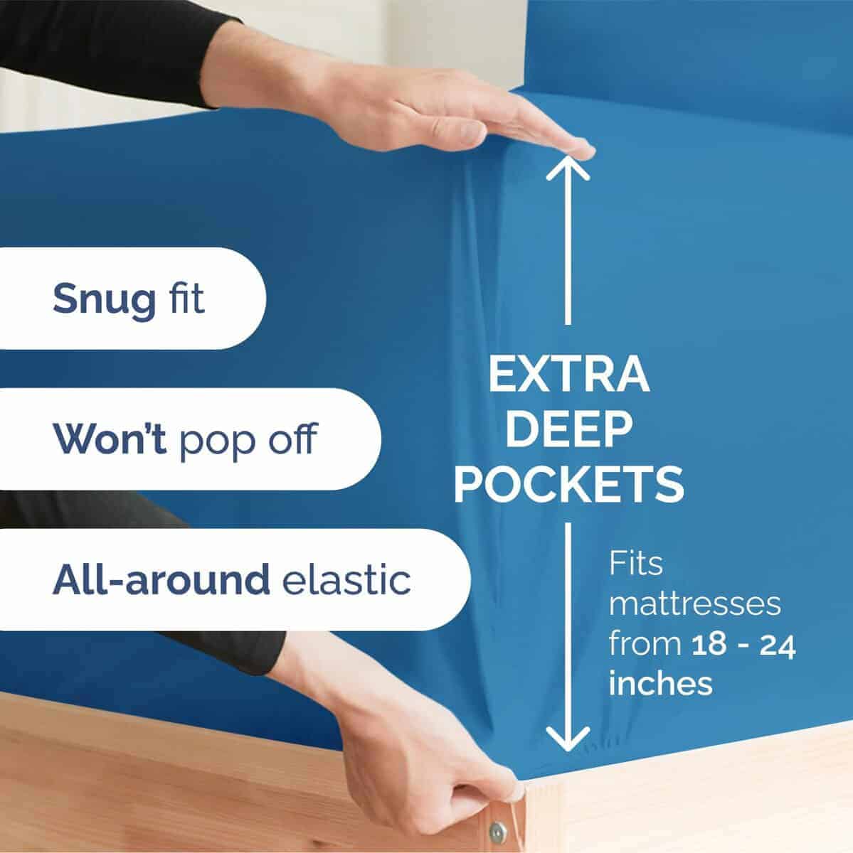 1. JUEGO DE SÁBANAS EXTRA PROFUNDAS: Estas sábanas están diseñadas para colchones muy profundos. Se adaptan a cualquier colchón con bolsillos de 18, 20, 21, 22 y 24 pulgadas de profundidad. El elástico elástico alrededor de la sábana ajustable extra profunda se estira para un ajuste perfecto alrededor de tu colchón. Perfecto para colchones extra altos y grandes. ¡Estas sábanas extragrandes se mantendrán apretadas y en su lugar!