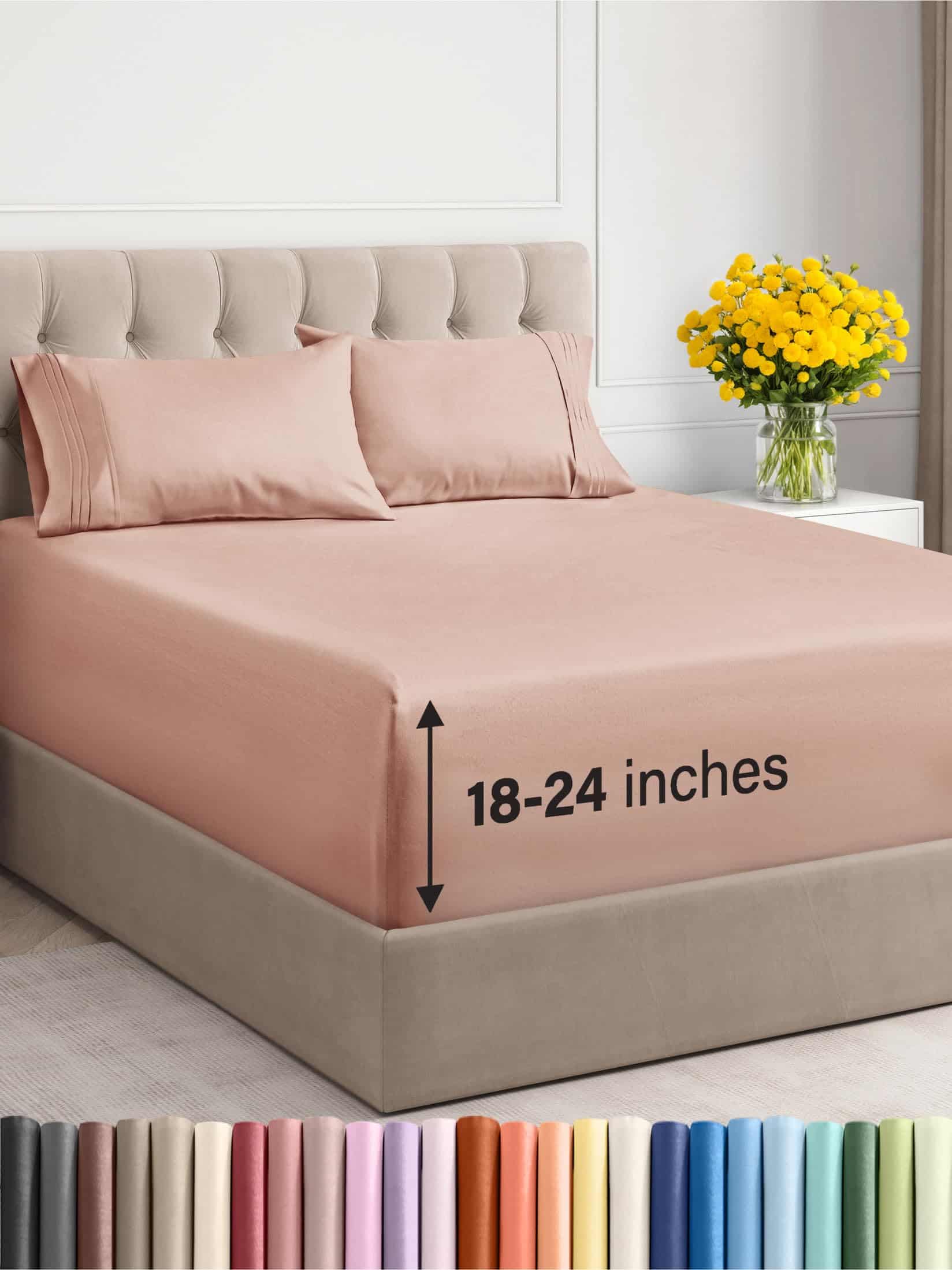 Estas sábanas son para colchones de bolsillos muy profundos. Se ajustan a cualquier colchón con bolsillos de 18, 20, 21, 22 y 24 pulgadas de profundidad. Hay un elástico elástico alrededor de la sábana ajustable extra profunda que se estira para un buen ajuste alrededor de tu colchón. Perfectas para colchones extra altos y grandes. ¡Descanse asegurado de que estas sábanas extragrandes se mantendrán apretadas y en su lugar!. Este juego de sábanas viene con 2 fundas de almohada en total con un hermoso diseño de bordado decorativo en cada funda de almohada. Las fundas de almohada tienen diseños de cierre. Este juego de ropa de cama se adaptará perfectamente a su colchón extra grueso. Estas sábanas son perfectas para colchones con un topper de 3 o 4 pulgadas en la parte superior, toppers de espuma viscoelástica, grandes almohadillas para colchones, colchones con pillowtop, toppers de espuma, grandes toppers de espuma, colchones de pillow top y memoryfoam. ¡Estas sábanas no se saldrán y se mantendrán en su lugar!. Dimensiones y tamaños: Sábana plana de 95 pulgadas de ancho y 102 pulgadas de largo. Sábana ajustada de 60 pulgadas de ancho y 80 pulgadas de largo con bolsillos de 21 pulgadas (tiene elástico para estirar). Todas las dos fundas de almohada son extragrandes 20 x 30 pulgadas.