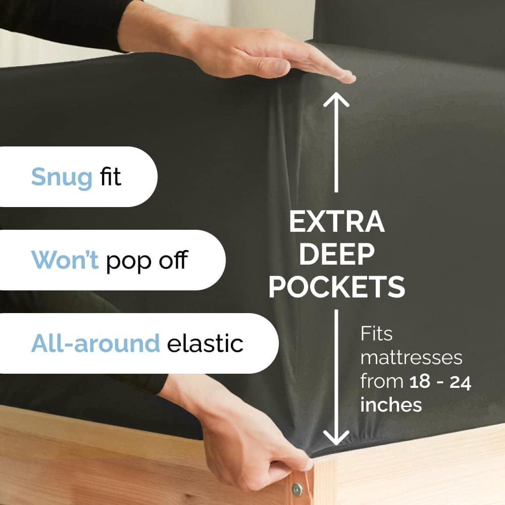 1. JUEGO DE SÁBANAS TWIN XL CON BOLSILLOS EXTRA PROFUNDOS / SÁBANAS AJUSTADAS TWIN XL EXTRA PROFUNDAS: Estas sábanas son para colchones muy profundos. Se ajustan a cualquier colchón con bolsillos de 18, 20, 21, 22 y 24 pulgadas de profundidad. Hay elástico elástico alrededor del ajuste extra profundo de la sábana que se estira para un buen ajuste alrededor de su colchón. Perfecto para colchones extra altos y grandes. ¡Tenga la seguridad de que estas sábanas extragrandes se mantendrán ajustadas y en su lugar!