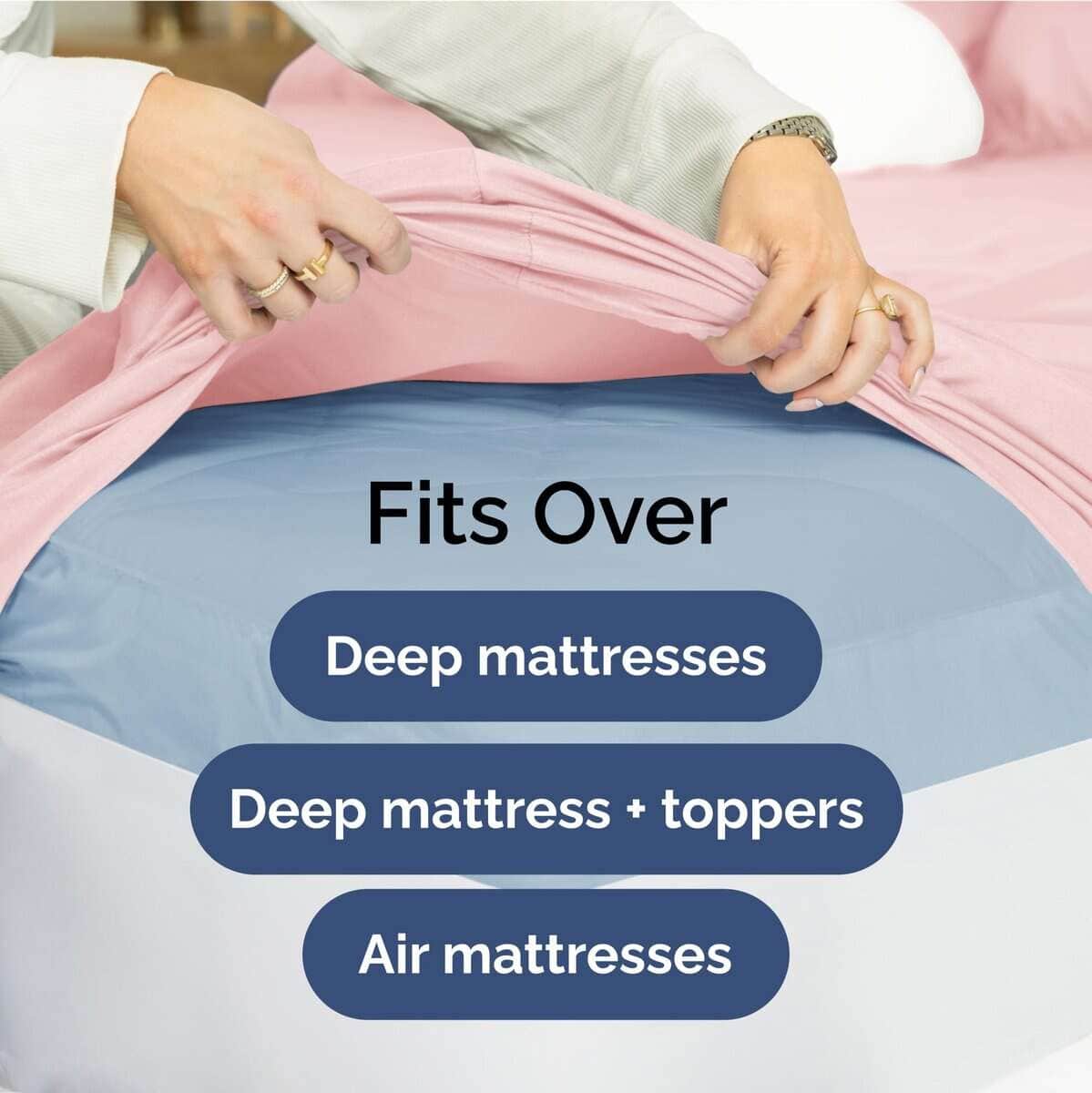 3. IDEAL PARA COLCHONES CON COLCHONETA DOBLE: Estas sábanas son perfectas para colchones con una colchoneta de 3 o 4 pulgadas en la parte superior, colchonetas de espuma viscoelástica, almohadillas de colchón grandes, colchones con colchoneta, colchonetas de espuma, colchonetas grandes de espuma, colchones con colchoneta y espuma viscoelástica. Estas sábanas no se saldrán.