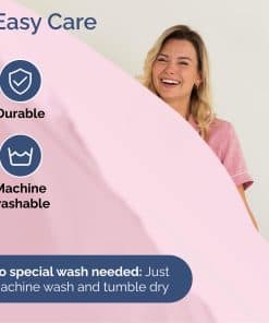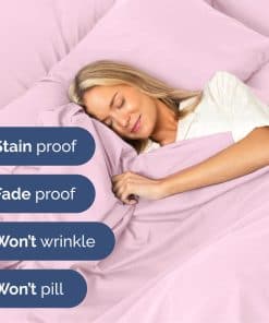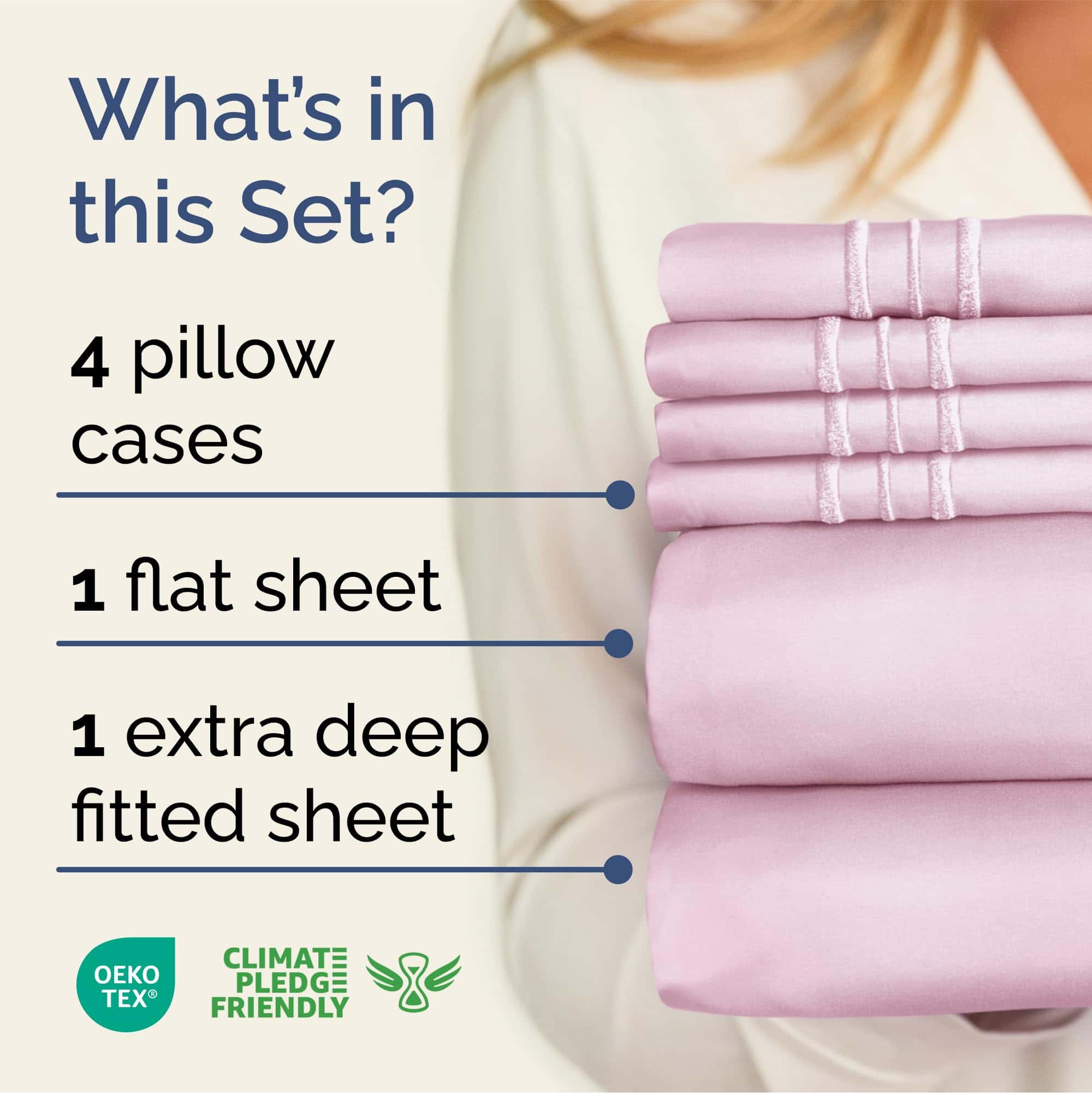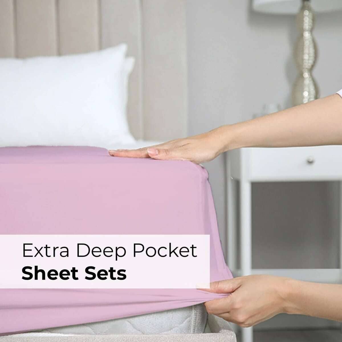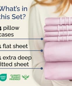 Esta es una lista detallada de sábanas para cama King California con un ajuste excepcionalmente profundo y un lujo digno de un hotel. El juego de sábanas incluye un total de 6 piezas, con una sábana plana y una sábana bajera diseñadas específicamente para colchones extra profundos de 18 a 24 pulgadas. Las sábanas están fabricadas con microfibra de la más alta calidad, que ofrece una suavidad excepcional y una sensación ligera. Las cuatro fundas de almohada incluidas en el juego cuentan con un hermoso diseño de bordado y cierres de calidad para mantener las almohadas en su lugar. Estas sábanas son perfectas para colchones con toppers de memoria, colchones con toppers gruesos, colchones con toppers de espuma, colchones con colchones superiores dobles y mucho más. Disfrute de la comodidad y el lujo que estas sábanas extra profundas pueden ofrecerle. ¡Haz que tu cama sea un oasis de relajación con este juego de sábanas excepcionalmente suaves y transpirables en un hermoso tono de rosa claro!