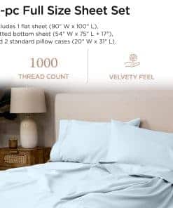 1. Puro algodón Supima y tejido de satén premium para tu comodidad: Diseñadas para una experiencia celestial, nuestras gloriosas sábanas de algodón de 1000 hilos tienen el tacto acogedor perfecto para tu buena noche de sueño. Estos lujosos juegos de ropa de cama están hechos con hilos de algodón Supima 100% naturales, brindándoles una suavidad y suavidad superior. Son el epítome de lujo y durabilidad empaquetados en uno. El tejido de satén transpirable le da a las sábanas un brillo natural y las hace perfectas para cada temporada. 2. Juego de ropa de cama elegante con sábanas inferiores de bolsillos profundos de tamaño generoso: Obtén la sensación de dormir en nubes exuberantes y espesas con nuestro rico juego de sábanas de alto conteo de hilos. Cada lujoso juego de sábanas Full size de 4 piezas que incluye 1 sábana plana (90″ Ancho x 100″ Largo), 1 sábana ajustable (54″ Ancho x 75″ Largo + 17″ bolsillo profundo) y 2 fundas de almohada estándar (20″ Ancho x 31″ Largo). Duerme sin preocuparte por la ropa de cama arrugada en nuestra sábana inferior ajustada. Tiene un bolsillo profundo de tamaño generoso con una goma elástica alrededor. 3. Acabado premium, artesanía diligente y conveniencia, todo en uno: Desde la finura innegable hasta la durabilidad de larga duración, nuestra colección de mayor conteo de hilos tiene todo lo que mereces. Cada sábana está expertamente tejida con hilos de algodón Supima de fibra extra larga y probada para garantizar que no haya bolitas, fibras sueltas y resistencia al desgaste. Lava a máquina estas sábanas extraordinarias a temperatura ambiente y dóblalas justo después para evitar el encogimiento y prevenir las arrugas. 4. Prácticas certificadas y sostenibles con garantía de satisfacción del 100%: Nos enorgullecemos de hacer algunas de las mejores sábanas del mundo respetando el medio ambiente. Nuestros productos y prácticas están libres de productos químicos dañinos, obteniendo la certificación OEKO TEX. Todas estas sábanas premium están fabricadas en una fábrica alimentada por energía eólica y solar. Se empaquetan en una bolsa de tela de algodón reutilizable y se entregan con garantía de satisfacción del 100%, brindándote un servicio al cliente excepcional.