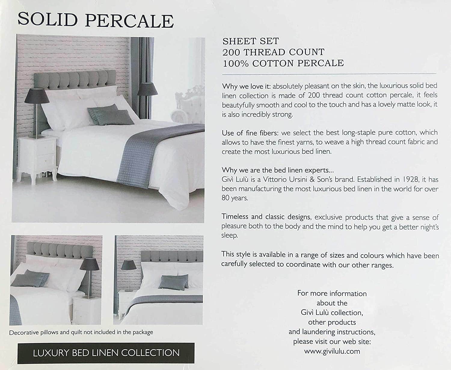 Este juego de sábanas de lujo Givi Lulu de 4 piezas es blanco sólido con múltiples patrones hermosos. La ropa de cama de lujo italiana de Givi Lulu es conocida por su excelente calidad y hermosos diseños. Este juego de sábanas es 100% algodón, suave al tacto y transpirable y cómodo durante la noche. El set incluye 1 sábana plana, 1 sábana ajustable y 2 fundas de almohada.