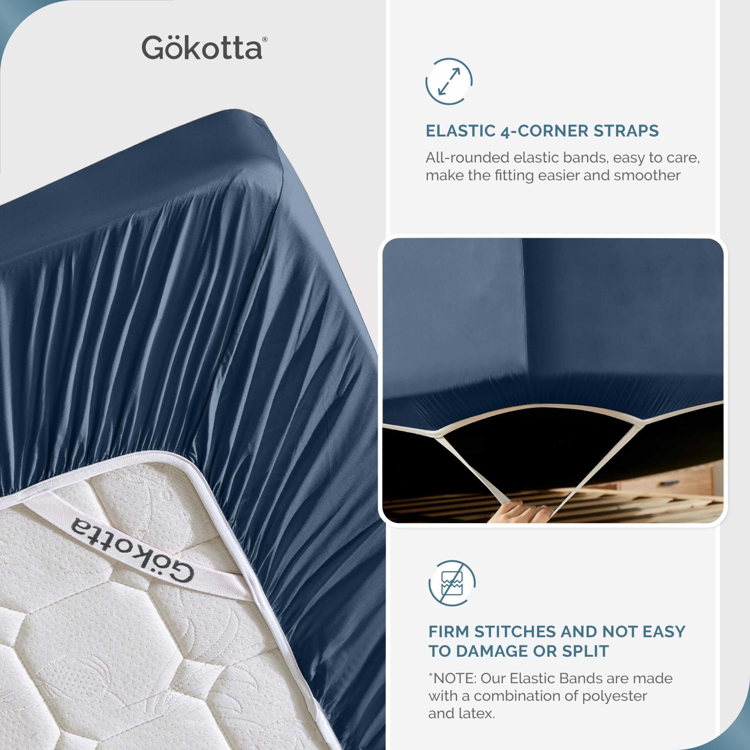 3. PERMANEZCA EN SU LUGAR – La sábana ajustable está diseñada con 4 correas elásticas en las esquinas y correa elástica de 360 grados que se mantendrá perfectamente en su lugar todas las noches. Las sábanas tamaño split king de Gokotta con 4 bandas elásticas están hechas con una combinación de poliéster y spandex.