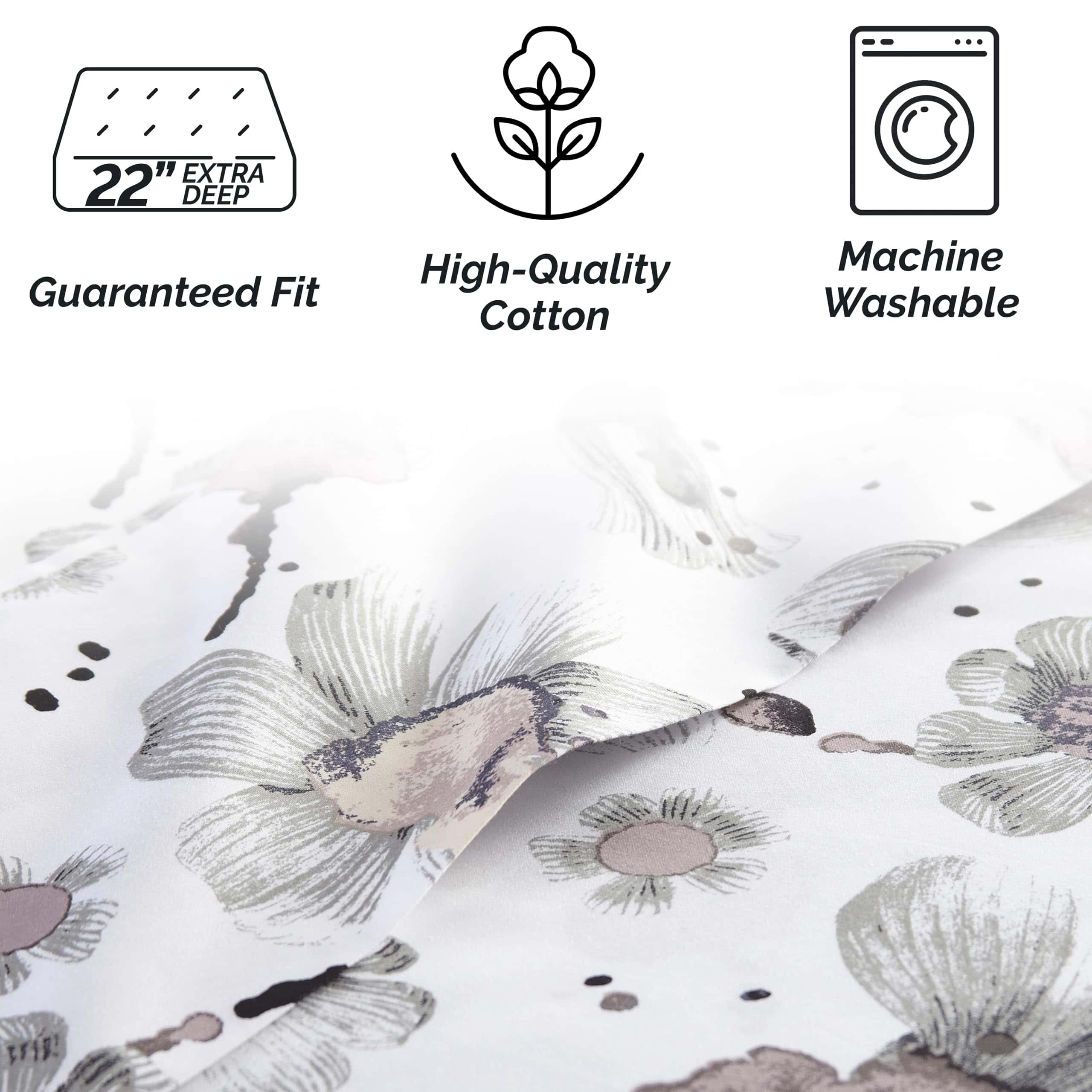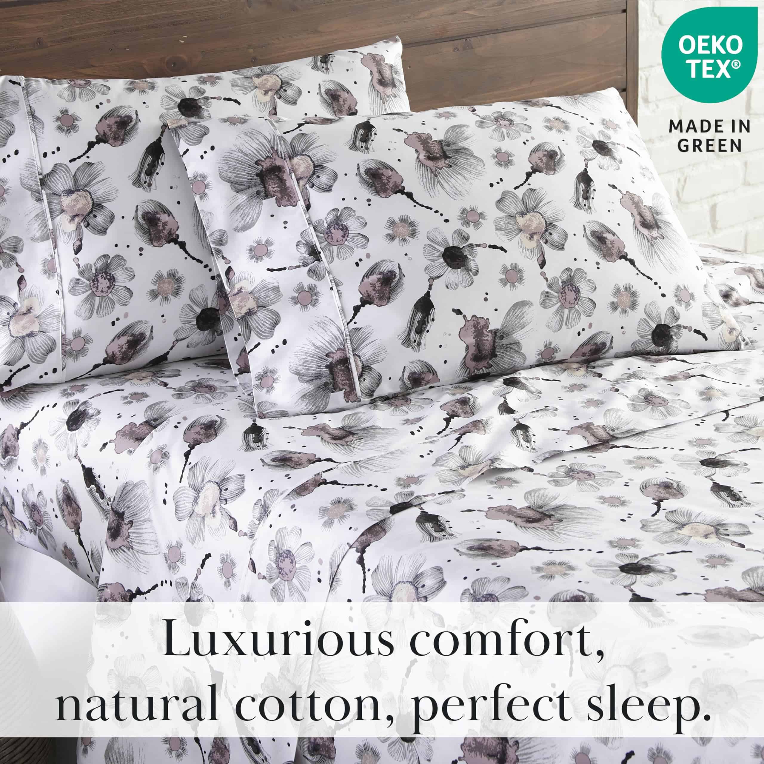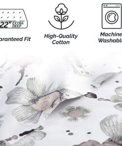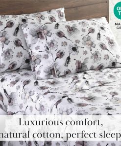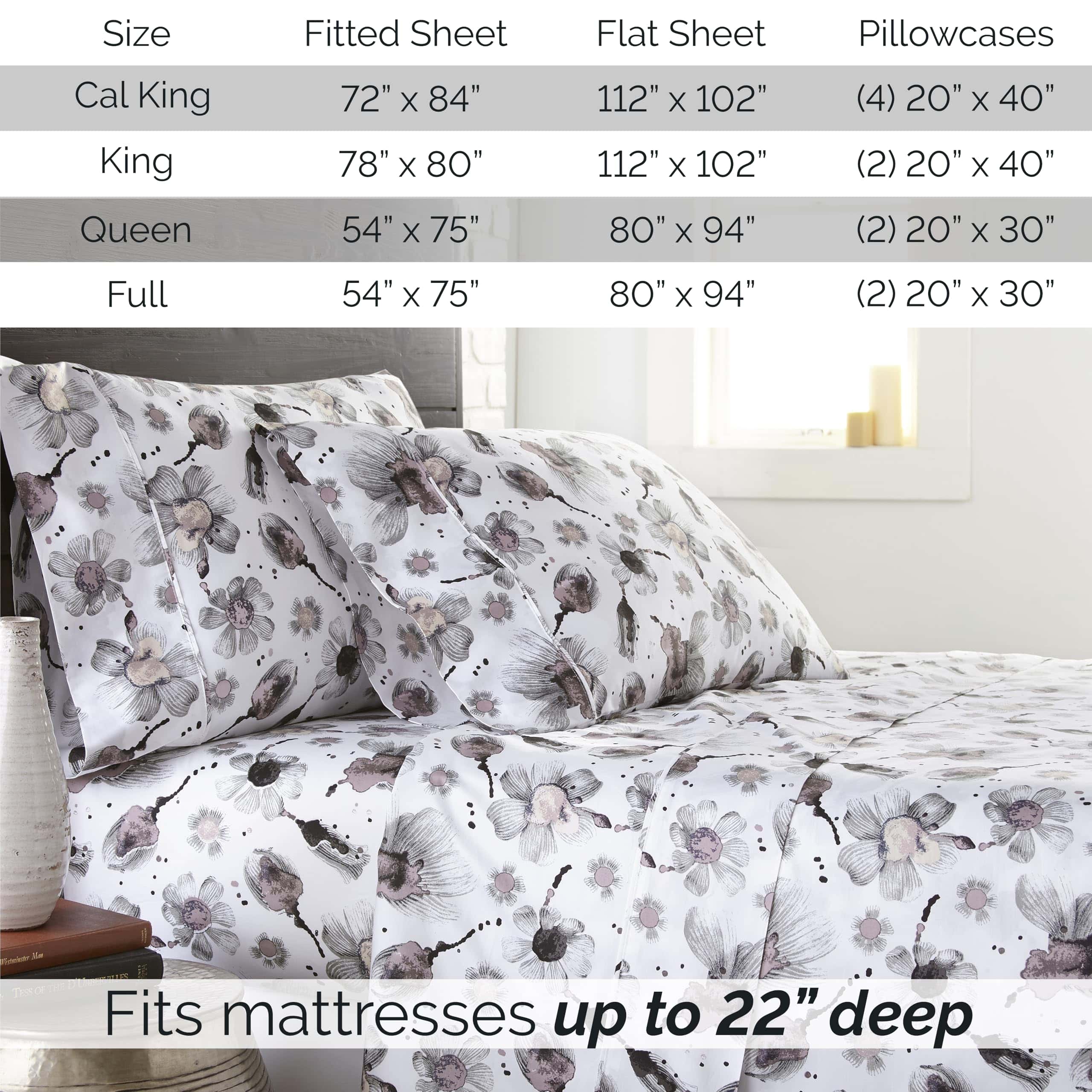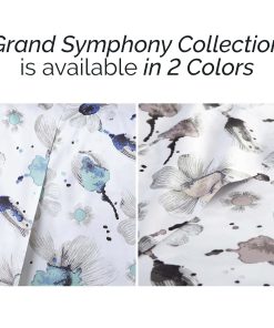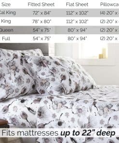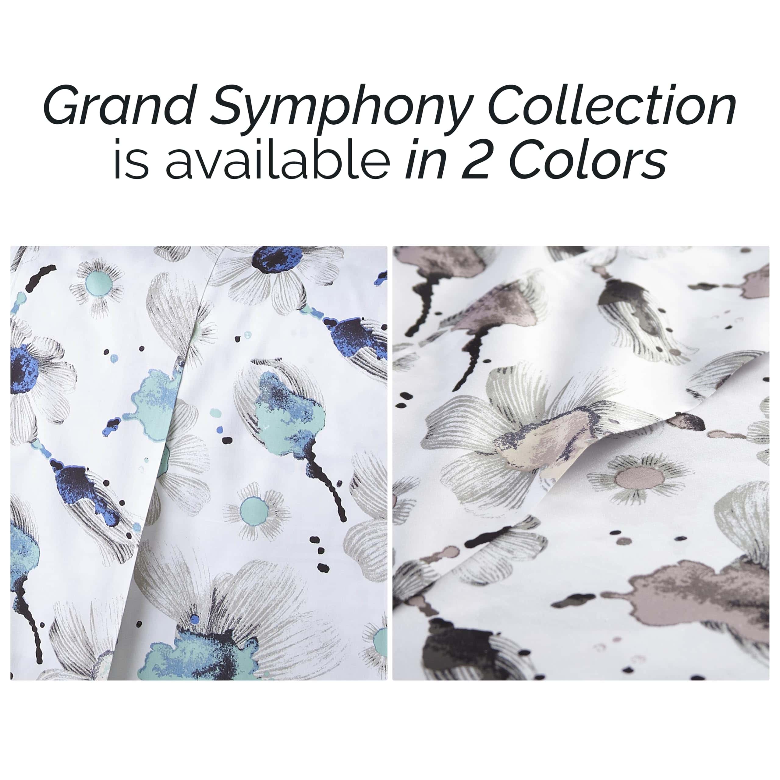 Juego de sábanas King Grand Symphony de bolsillo extra profundo de 4 piezas que incluye 1 sábana ajustable de bolsillo extra profundo totalmente elástica (78 pulgadas x 80 pulgadas x 22 pulgadas de profundidad), 1 sábana plana king (112″ x 102″) y dos fundas de almohada king (20″ x 40″).