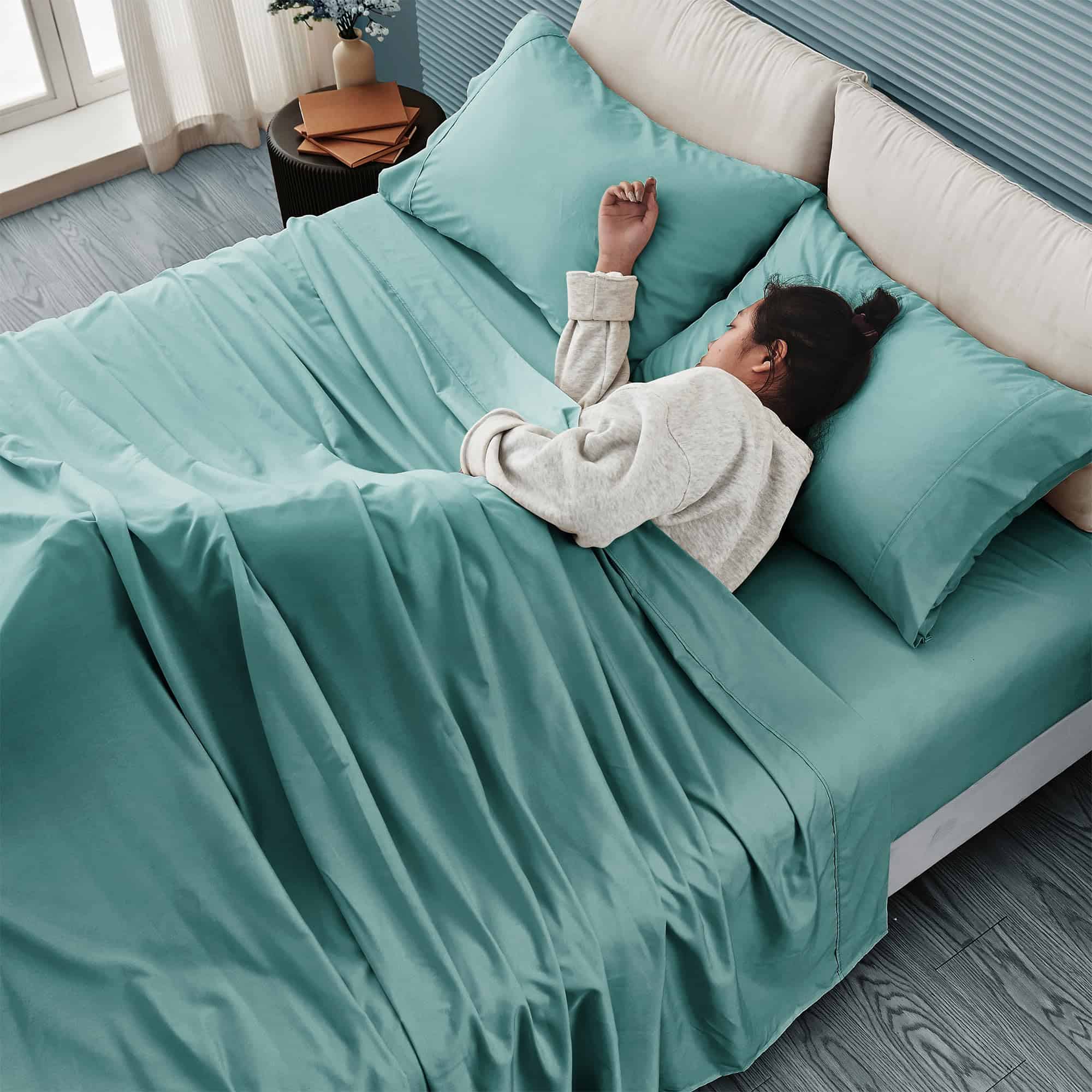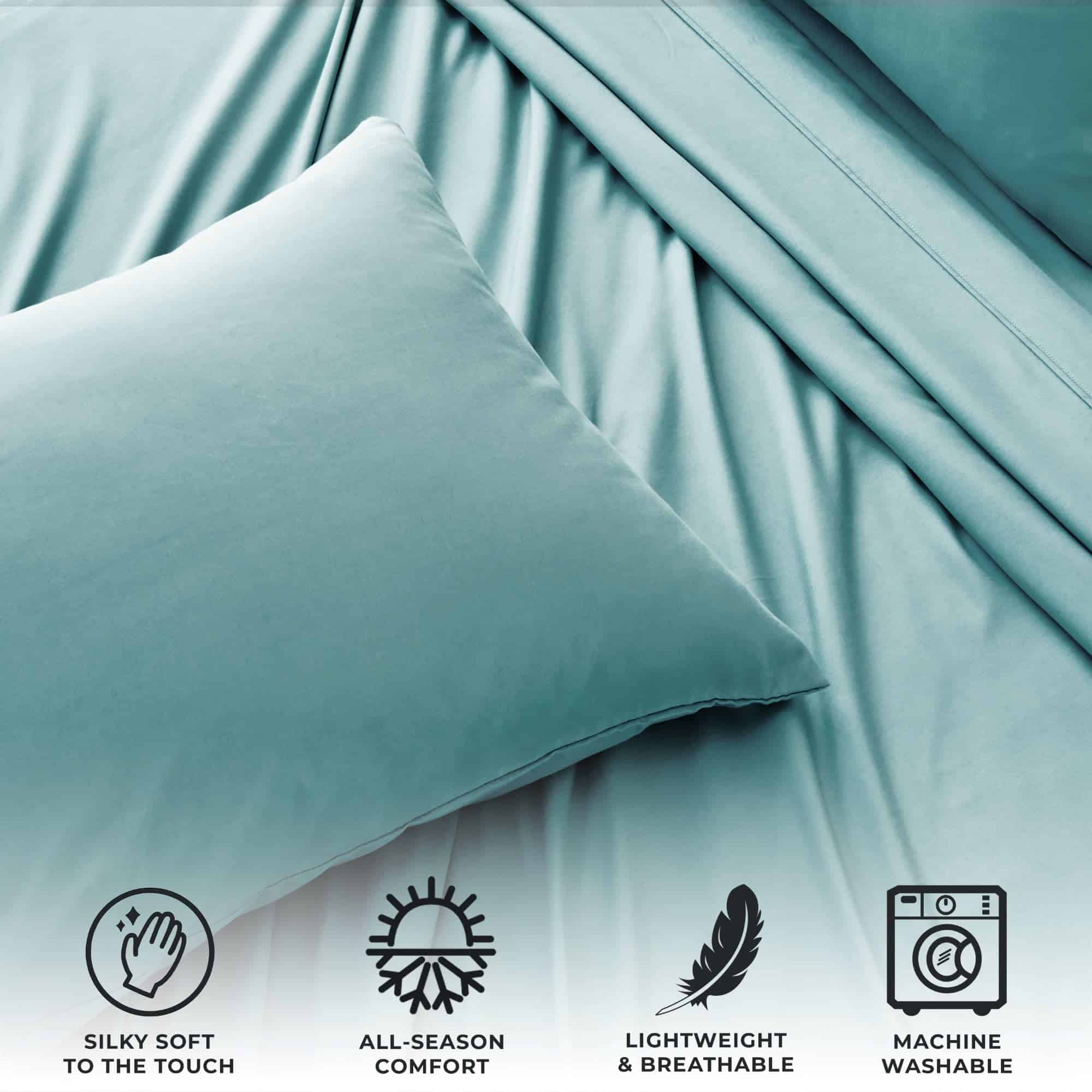 2. Transpirable, refrescante, suave como la seda: Estas sábanas asequibles hechas de bambú se sienten suaves como la seda contra tu piel. Son transpirables, refrescantes y perfectas para los que duermen calientes. Estos juegos de sábanas y fundas de almohada son el juego de ropa de cama ideal para una decoración de habitación moderna.