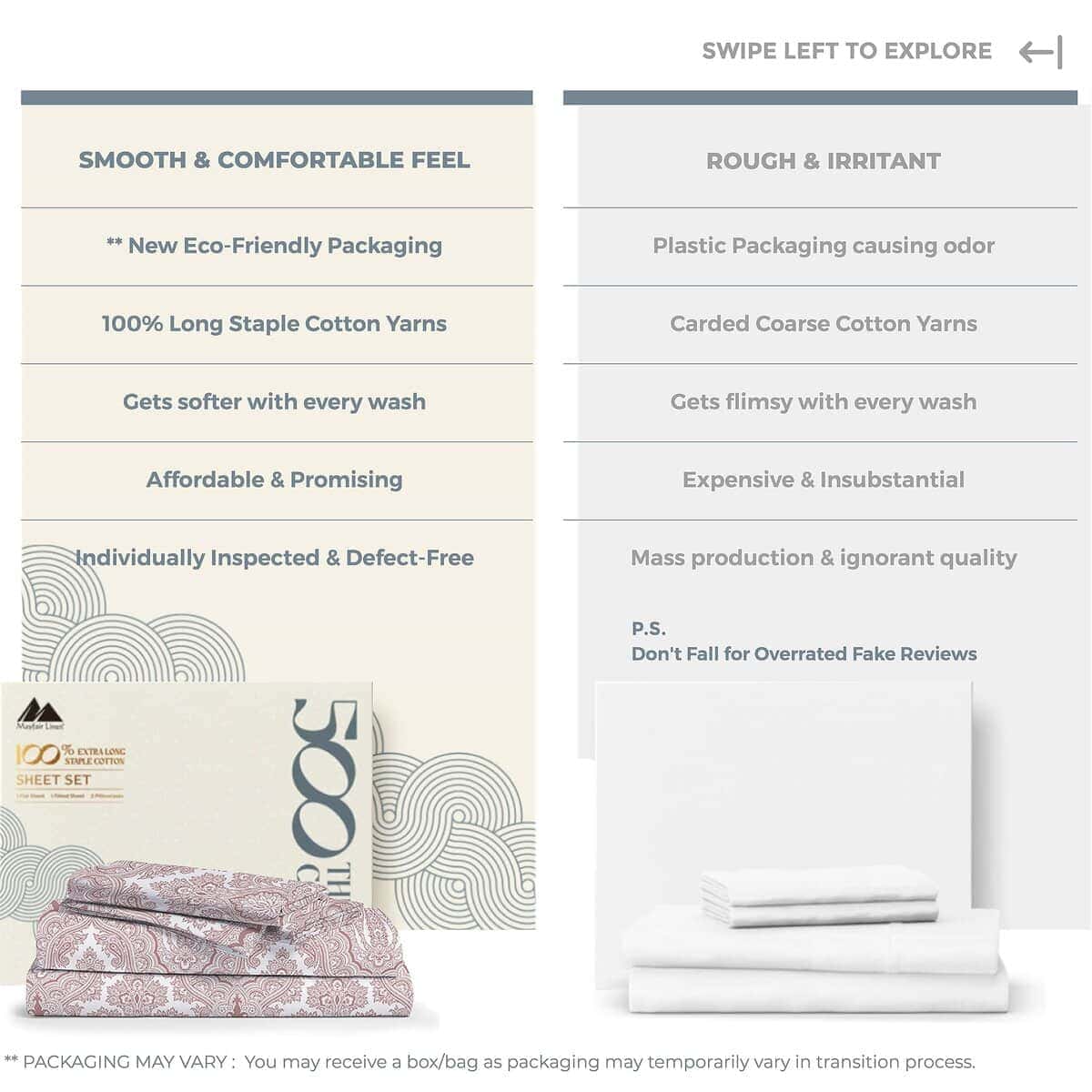 1. Más suaves que otras sábanas de algodón con el mismo número de hilos: Nuestro juego de sábanas de 500 hilos está hecho de algodón de fibra extra larga con una longitud de fibra más larga que produce una superficie más fuerte y suave. La tela luego se merceriza para obtener un brillo extra y una textura sedosa, y para mejorar la profundidad del color para que las sábanas no se descoloren ni formen pelusas en el lavado. Esto hace que nuestras sábanas de 500 hilos sean más suaves y duraderas que otras sábanas en el mercado. 2. Peso ligero y suave + Amable con el bolsillo: Estas sábanas de algodón son ligeras y frescas como el aire y transpirables en veranos calurosos. El acabado satén brinda una sensación sedosa de la habitación de hotel. Nuestros juegos de sábanas split king para cama ajustable incluyen 5 piezas: 1 sábana plana o superior (108 cm de ancho x 106 cm de largo), 2 sábanas ajustadas o inferiores (39 cm de ancho x 80 cm de largo + 16 bolsillos profundos), y 2 fundas de almohada king (21 cm de ancho x 40 cm de largo). Combina las sábanas split king con un edredón, una funda nórdica y una manta de nuestra colección de decoración para el hogar. 3. Sábanas con bolsillos profundos y elástico de 360 para abrazar tu colchón: Vamos a hablar de nuestras sábanas ajustadas ahora, ¿de acuerdo Nuestras sábanas ajustadas de bolsillo profundo se adaptan fácilmente a un colchón ajustable de hasta 16 pulgadas y el elástico alrededor asegura la sábana al colchón. No necesitas correas o sujetadores para mantenerlas en su lugar por la noche. Las etiquetas inteligentes indican los lados largos y cortos del juego de sábanas split king. 4. Sábanas de algodón 100% ecológicas para pieles sensibles: Si te preocupa dormir bien, deja de lado las sábanas de microfibra y duerme en nuestro juego de sábanas de algodón 100%. El algodón es natural, ecológico, refrescante y súper transpirable. Solo obtenemos algodón de fibra larga que es suave y gentil con tu piel. Nuestras sábanas de algodón están certificadas como STANDARD 100 por OEKO-TEX, lo que significa que no hay sustancias químicas nocivas o tintes textiles en sus sábanas. Es perfecto para tu dormitorio y el de los niños. 5. El regalo que sigue dando. Sueño: Si estás buscando el mejor regalo para el Día de la Madre, el Día del Padre, Navidad, el Día de San Valentín, Halloween, bodas, vacaciones y festividades de otoño, ¿por qué no probar nuestros juegos de sábanas split top king para cama ajustable Si no te gustan nuestras lujosas sábanas de algodón egipcio, siempre puedes cambiarlas o obtener un reembolso. Solo asegúrate de solicitar una devolución/reembolso dentro de los 30 días posteriores a la compra según las pautas.