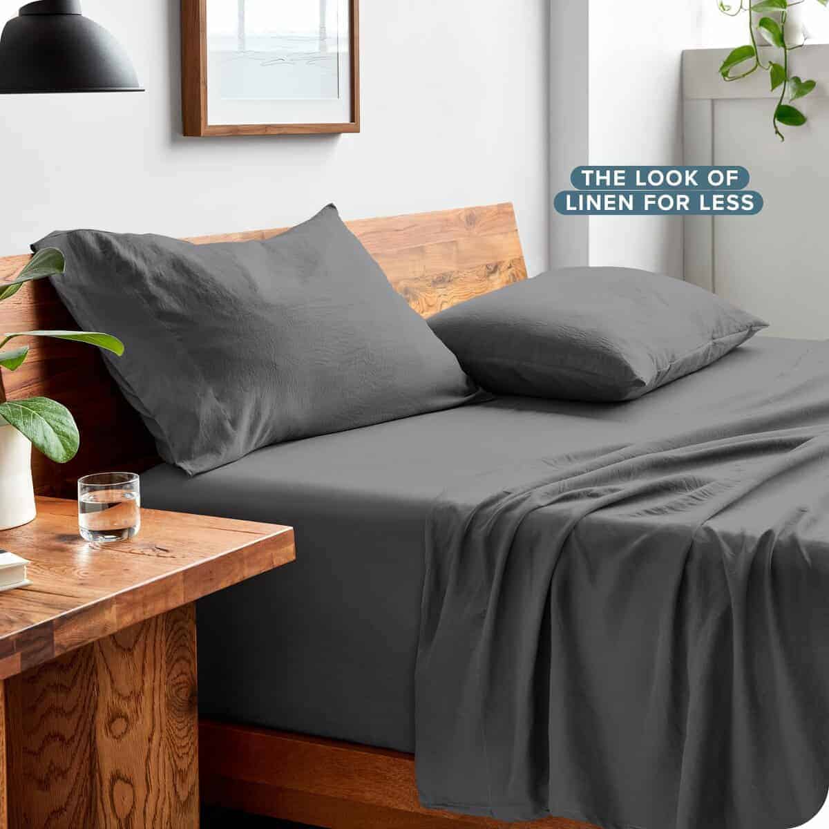1. SÁBANAS ULTRA SUAVES: Imagina la suavidad de tu camiseta vintage favorita, pero para tu cama. Nuestras sábanas de microfibra lavada pasan por un proceso único de acabado de tela para sentirse irresistiblemente suaves, creando una textura arrugada naturalmente relajada similar al lino. Aquí no hay telas crujientes ni rígidas. Completa tu look de ropa de cama con nuestro edredón lavado a juego y otros productos de Bare Home.