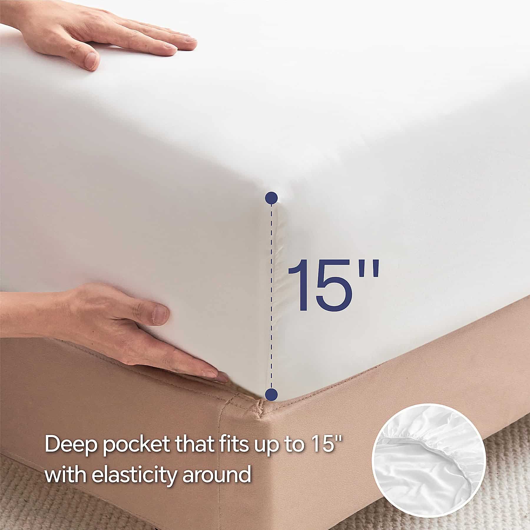3. Bolsillo Profundo y Ajuste Fácil: El diseño especial de bolsillo profundo puede adaptarse a colchones de hasta 15 pulgadas de grosor. Ya no tienes que preocuparte por que se resbale tu sábana, nuestros productos encajan perfectamente y se mantienen seguros. La banda elástica alrededor del borde garantiza un ajuste seguro que no se desplaza mientras duermes.