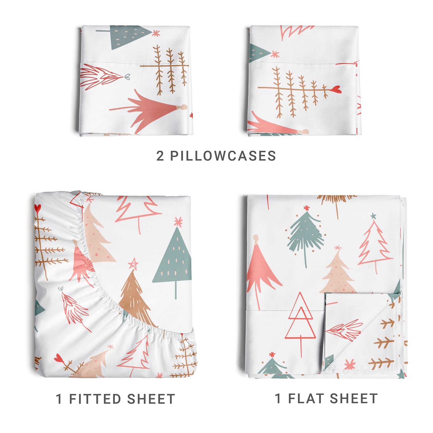 1. ¡Ten unas felices fiestas con nuestro juego de sábanas festivas de 4 piezas! 2 fundas de almohada, 1 sábana plana y sábana ajustable. Sábana Plana (108″ x 102″) Sábana Ajustable (80 x 78) 2 Fundas de Almohada (20 x 40).