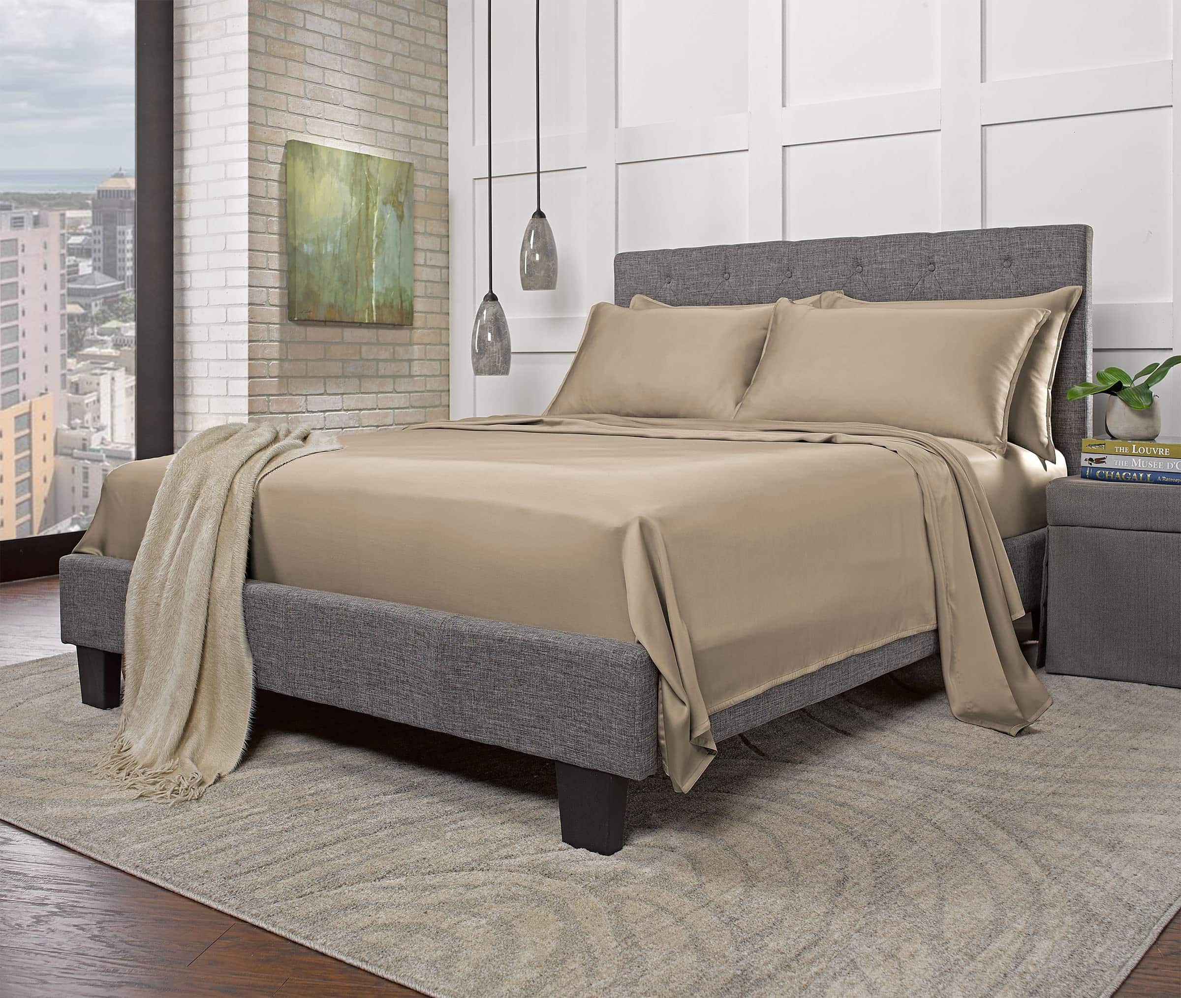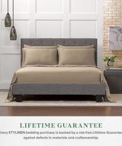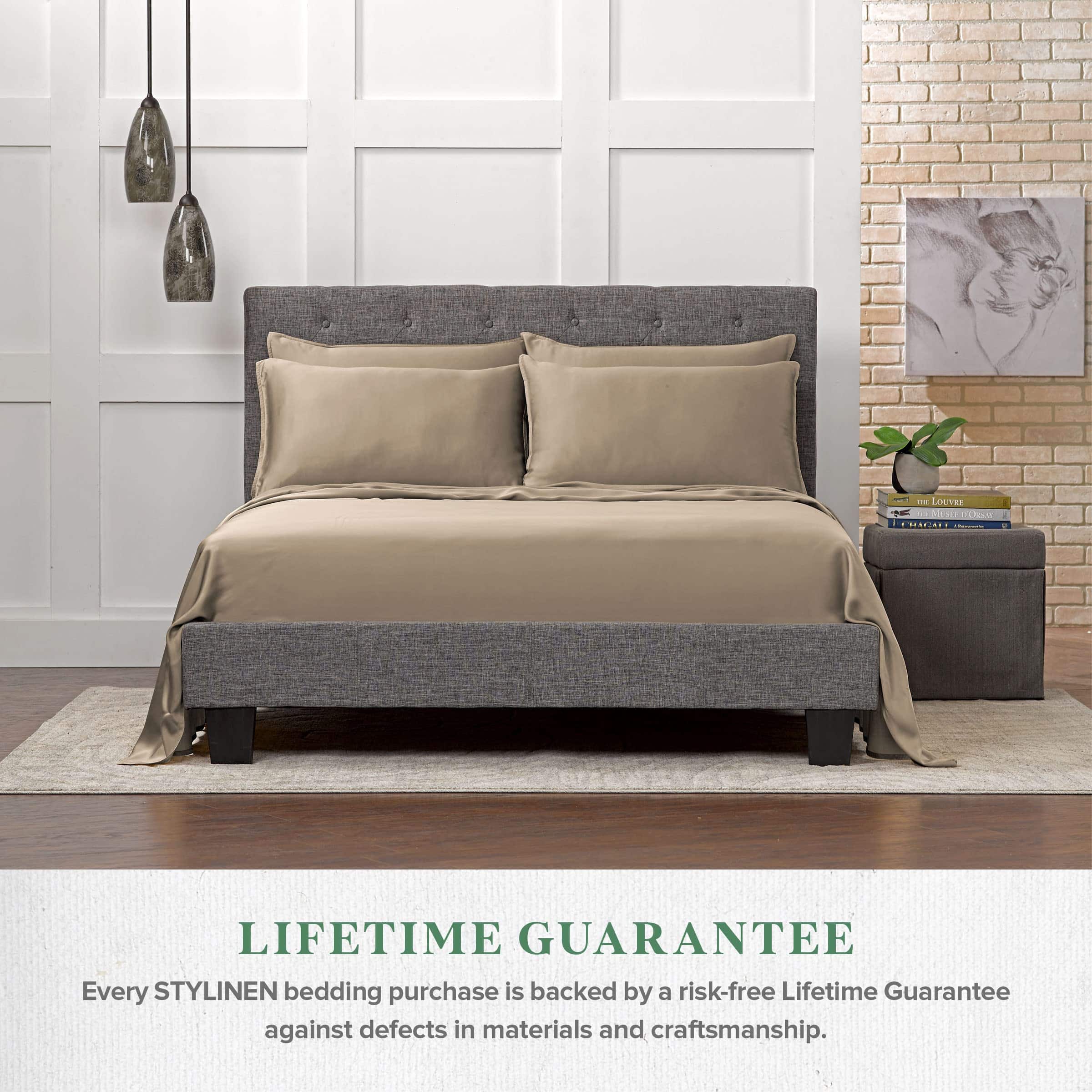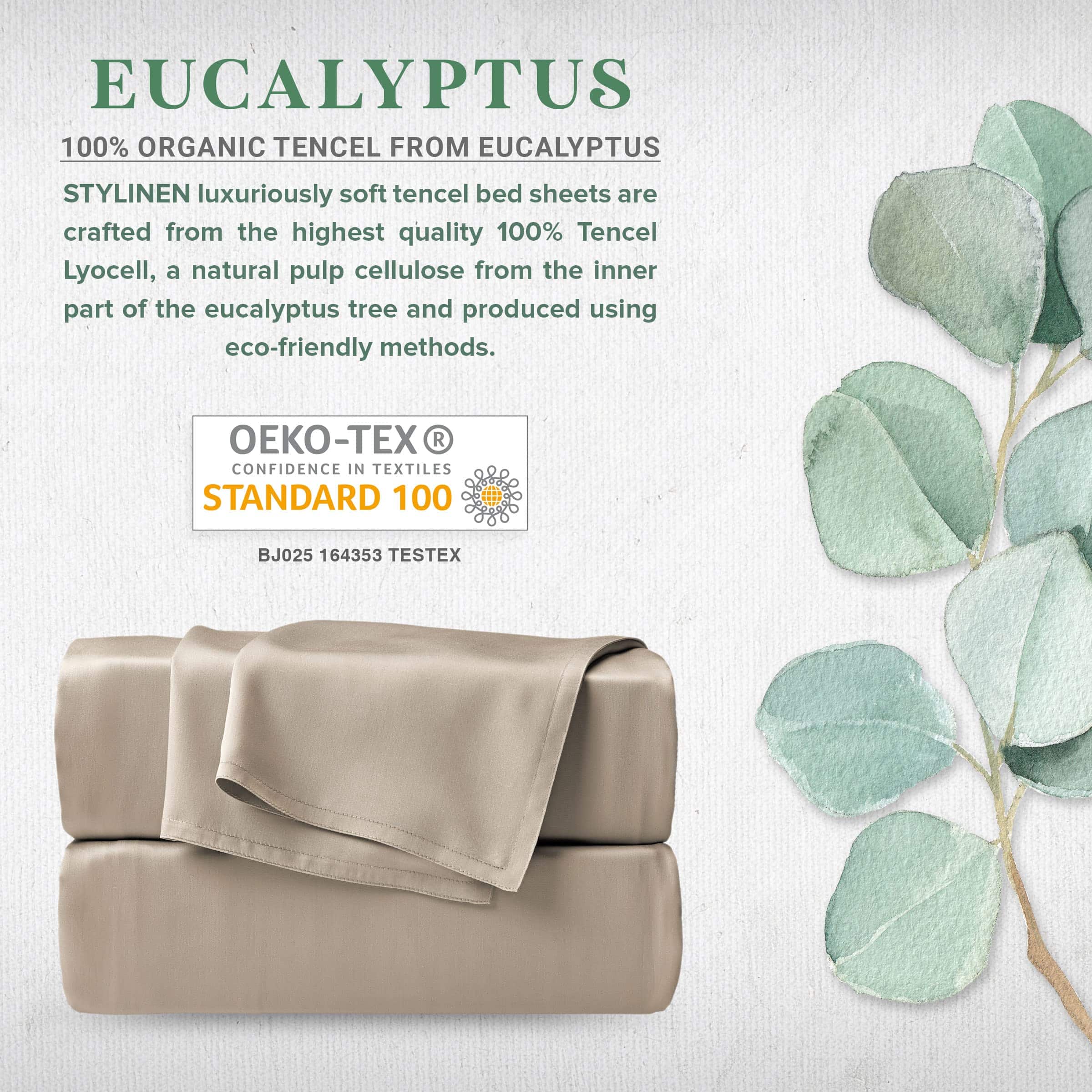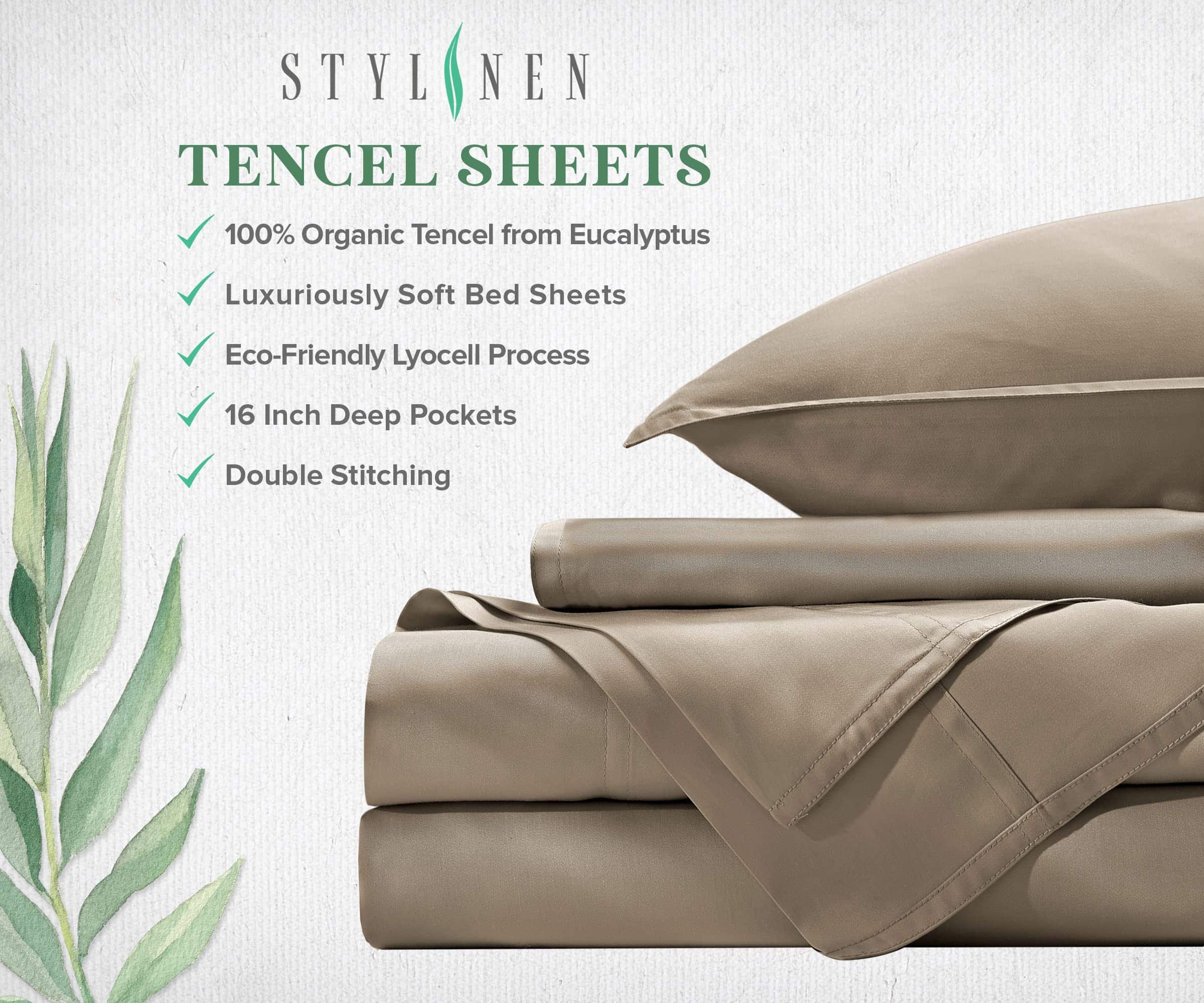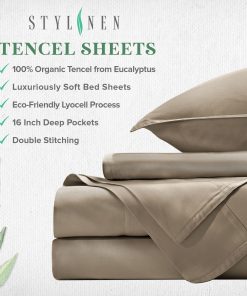 CRAFTED FROM 100% ORGANIC PURE EUCALYPTUS TENCEL – STYLINEN luxury bed sheets are made from the highest quality 100% Tencel Lyocell, a natural pulp cellulose from the inner part of the eucalyptus tree. Produced with eco-friendly methods, STYLINEN bedding is great for those with sensitive skin. Rest assured that you are covered by OEKO-TEX STANDARD 100 CERTIFIED environmental standards. COMPLETE 4-PIECE KING (76″x80″) BED SHEET SET includes 1 fitted sheet, 1 flat sheet and 2 envelope-style pillowcases with overlapping closure. The pillowcases and flat sheet feature high quality double-stitched seams to ensure long-lasting durability and easy care. DEEP FITTED POCKETS and a fully elasticized border ensures a snug and reliable fit over mattresses up to 16 inches thick. STYLINEN bed sheets are designed to resist fading, pilling and snags. Because STYLINEN eucalyptus fibers are more absorbent than cotton, they keep you cool and dry while you sleep. Another advantage of eucalyptus bed sheets is that they naturally resist odors and remain fresher longer. BREATHABLE, ALL-SEASON eucalyptus fiber fabric is thermo-regulating for ultimate comfort in spring, summer, winter and fall. The moisture-wicking properties of this resort-grade bedding keep you comfortable year-round and is perfect for those with sensitive skin. LIFETIME GUARANTEE, ECO-FRIENDLY – All STYLINEN bed sheets are backed by a Lifetime Guarantee. Made from eco-friendly and responsibly sourced materials.