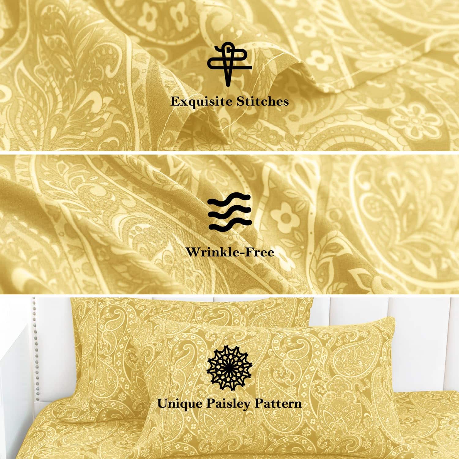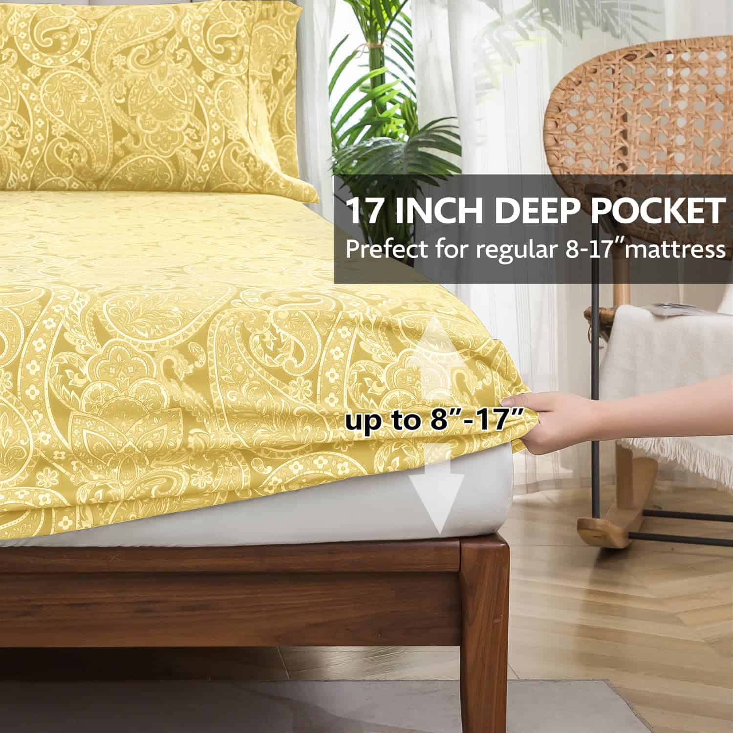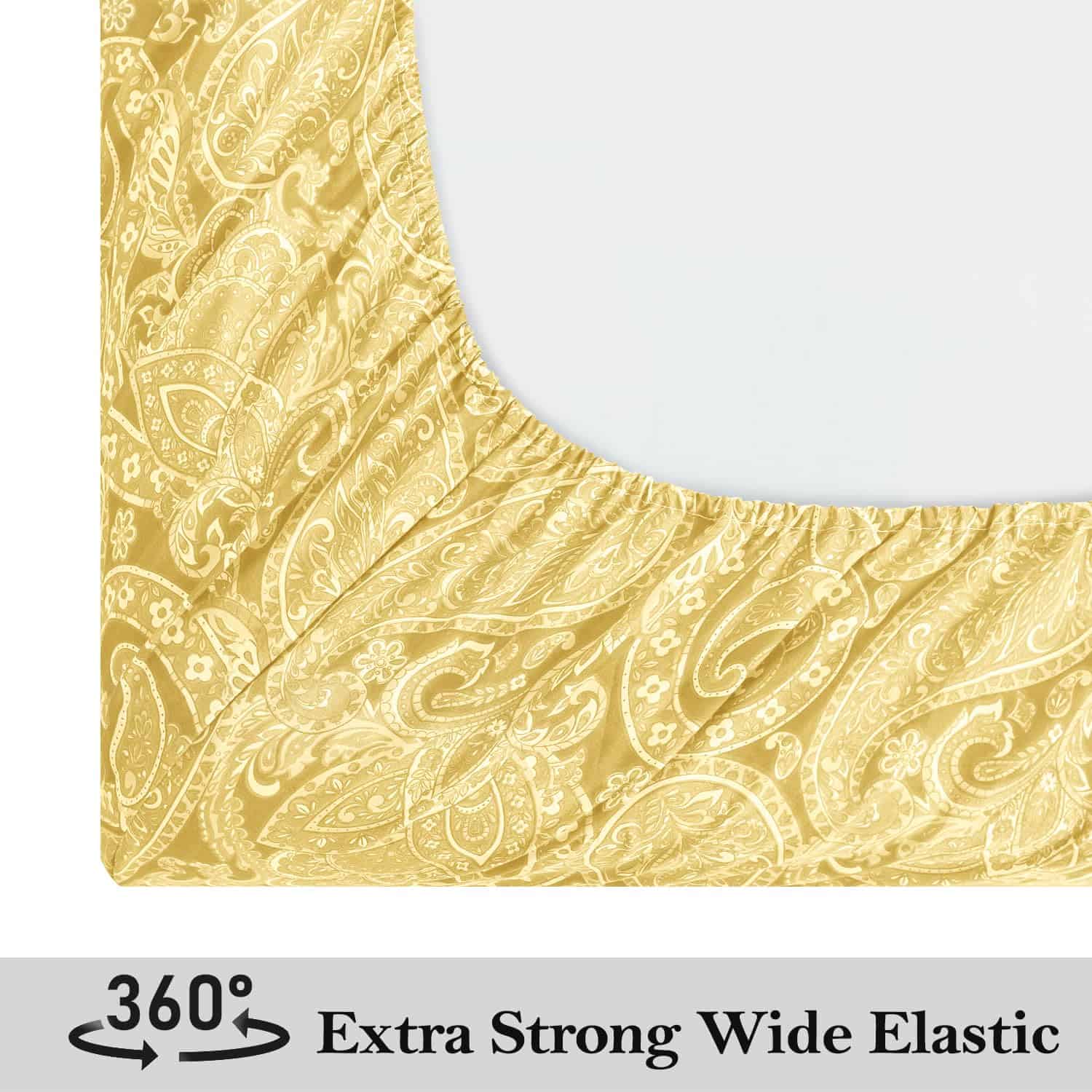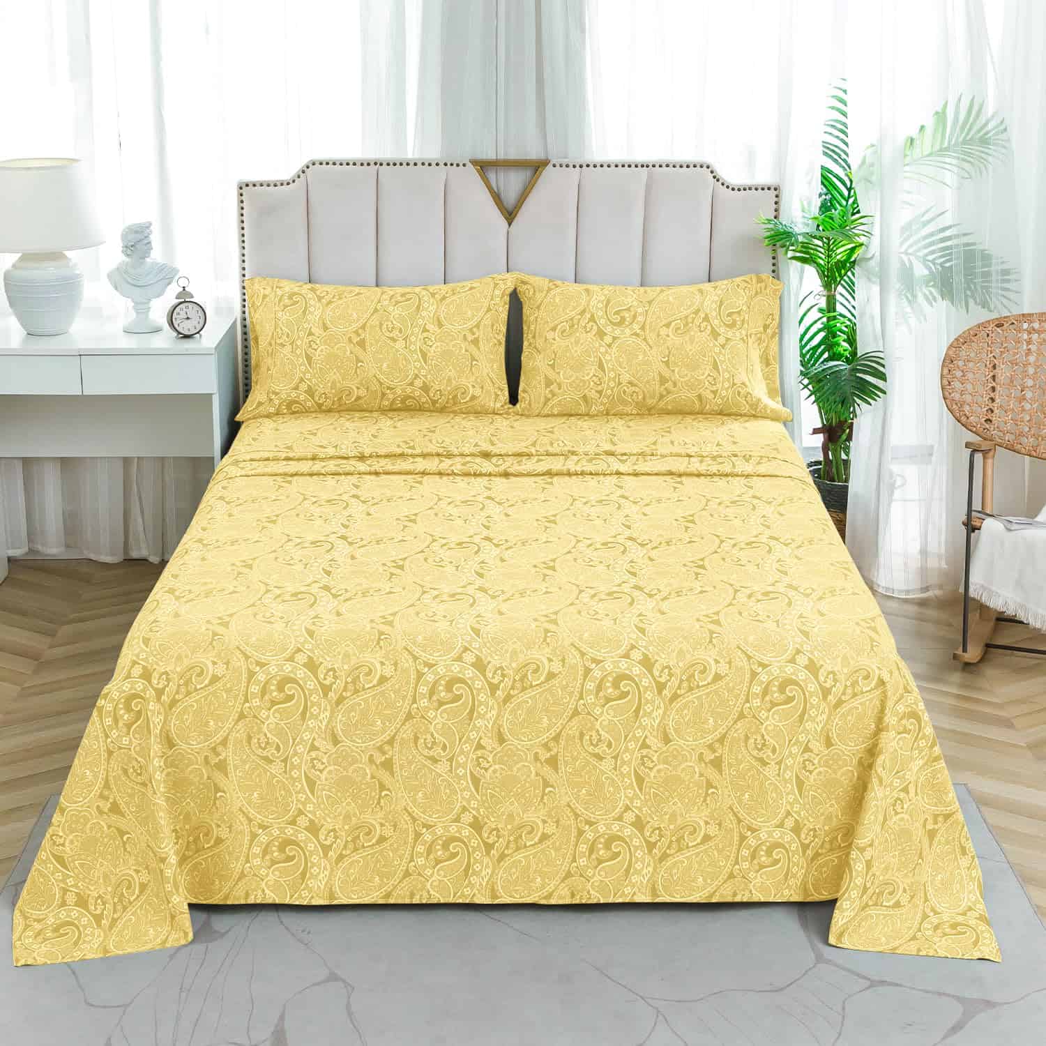 Nuestro juego de sábanas amarillas paisley de tamaño King consiste en una sábana plana de 108″ x 102″, una sábana ajustable de 78″ x 80″, y dos fundas de almohada de 20″ x 40″. Los suaves y cálidos 4 piezas lavables lavables de lavanda amarilla colección estampada de sábanas son adecuados para Navidad. El juego de ropa de cama viene en una caja de regalo con sábana plana, sábana ajustable y funda de almohada. Será un gran regalo de Navidad o cumpleaños para chicos, chicas, hombres y mujeres, mamás y papás. Es una buena elección para la decoración del hogar.