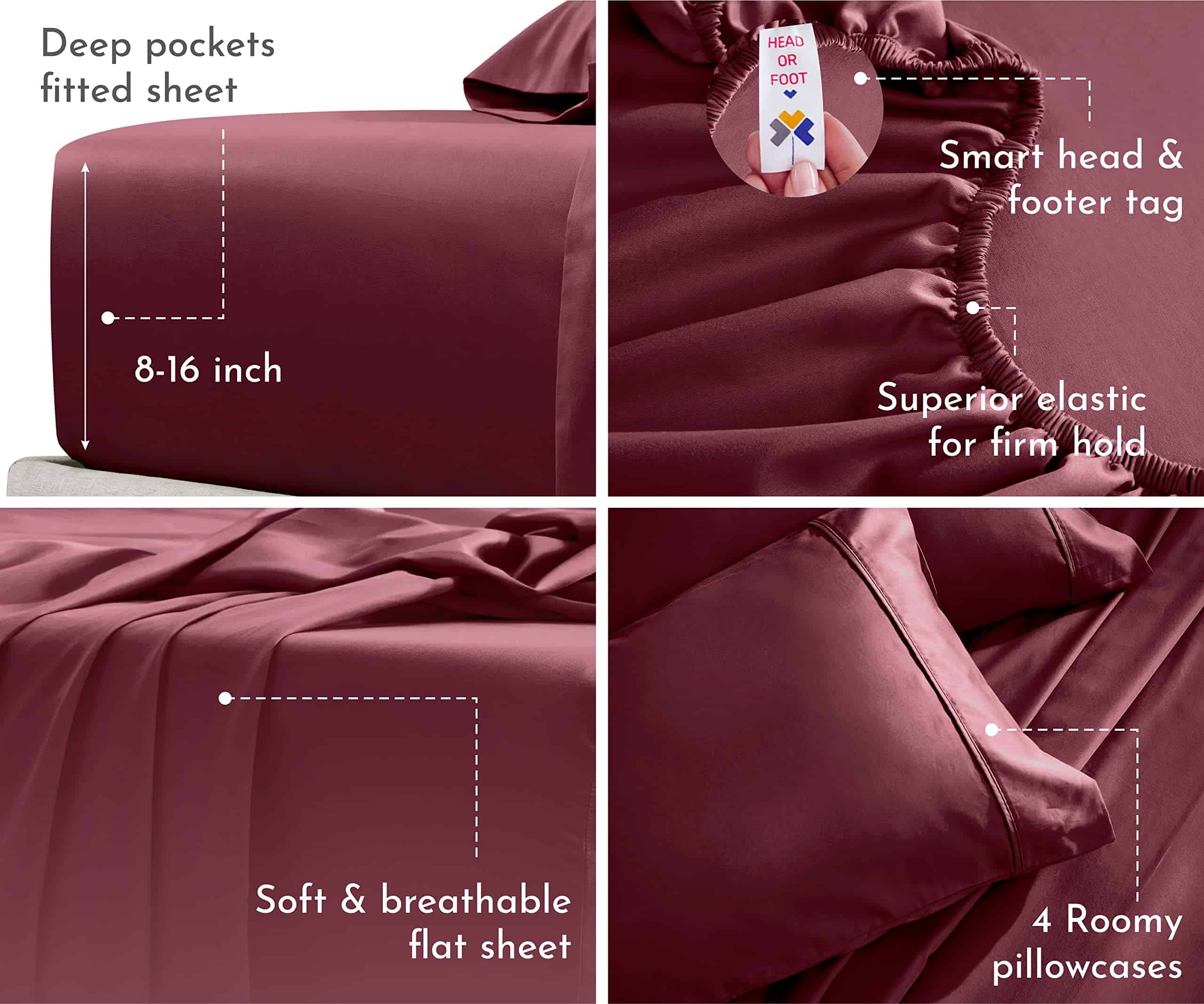 1. Juego de sábanas de 6 piezas con 4 fundas de almohada: juego de sábanas de cama king size 100% algodón de 400 hilos que incluye 1 sábana plana (112″ W x 102″ L), 1 sábana ajustable (78″ W x 80″ L + 16″ de bolsillo profundo) y 4 fundas de almohada espaciosas con cierre de sobre (21″ W x 36″ L). Nuestras sábanas de algodón son lo suficientemente duraderas para resistir la decoloración y las arrugas. 2. Disfruta de tu sueño: Experimenta el algodón puro, de fibra larga, más suave, fresco y transpirable. Nuestro juego de sábanas de algodón de 400 hilos con tejido de lino fino y fresco está cuidadosamente elaborado a mano y cosido firmemente para la perfección. 3. Confort de calidad hotelera: Las sábanas de algodón con bolsillo profundo para camas King size prometen un ajuste ceñido y cuentan con etiquetas inteligentes en la cabecera y los pies para ahorrar tiempo al hacer la cama. El tejido de satén firma del hotel hace que este sea tu juego de ropa de cama más cómodo. 4. Cuidado fácil: Es fácil cuidar nuestras sábanas de algodón 100%. Mételas en la lavadora para un lavado rápido. Estos juegos de sábanas King se vuelven más suaves con cada lavado y no se encogen, forman bolitas ni se decoloran. También han sido probados e certificados de forma independiente como Estándar 100 por Oekotex para estar libres de sustancias nocivas. 5. Nuestra Compromiso: En 2022 y 2023, donamos más de 22,000 piezas de ropa de cama a organizaciones benéficas locales en EE. UU. No utilizamos plástico en nuestro embalaje y nuestras sábanas se producen en nuestra fábrica de propiedad y operación familiar en India. Cada pieza es inspeccionada para garantizar la calidad y nos comprometemos a reemplazar cualquier producto defectuoso sin costo alguno para ti.