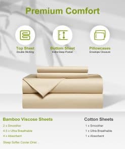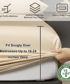 El juego de sábanas King contiene 1 sábana plana (108″x102″), 1 sábana ajustable (78″x80″) y 2 fundas de almohada (20″x40″). La sábana ajustable tiene un bolsillo extra profundo de 20 pulgadas que se estira para adaptarse al colchón de hasta 24″ pulgadas. Su tejido suave y sedoso es más suave que las sábanas de algodón egipcio y está diseñado para suavizarse con cada lavado, asegurando noches cada vez más acogedoras con el tiempo. Además, estas sábanas son hipoalergénicas y de fácil cuidado, siendo resistentes a la contracción y la decoloración. Lávalas en agua fría en un ciclo suave y cuélgalas para secar al aire o ponlas en la secadora a baja temperatura.