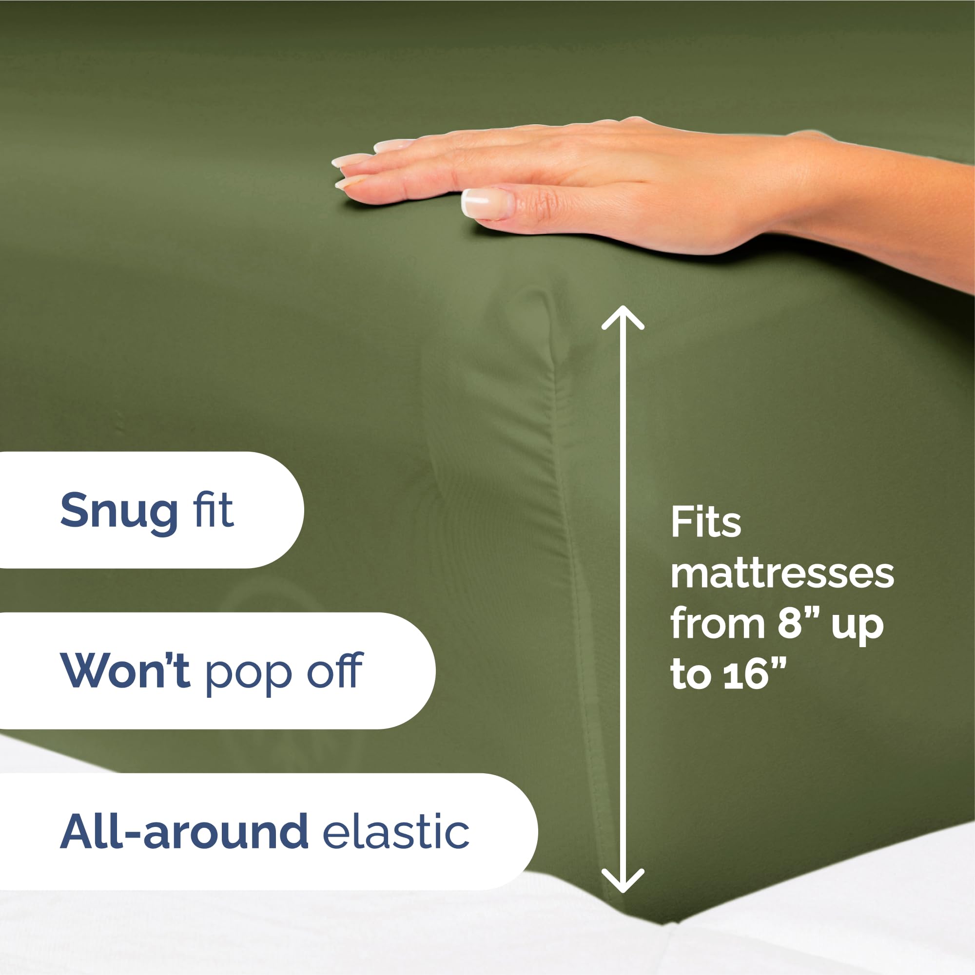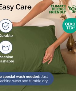 Juego de sábanas King Size de 4 piezas en color verde oliva profundo. Este juego incluye 2 fundas de almohada, una sábana plana y una sábana ajustable. La sábana plana tiene unas dimensiones de 108″ x 102″, mientras que la sábana ajustable mide 80 x 78 pulgadas. Las 2 fundas de almohada incluidas en este set miden 20 x 40 pulgadas cada una. Las sábanas cuentan con bolsillos profundos que se ajustan a colchones de hasta aproximadamente 16 pulgadas de profundidad. Son muy suaves, transpirables y frescas, superando en suavidad a las sábanas de algodón egipcio y algodón orgánico. Están hechas de microfibra de doble cepillado de la más alta calidad, lo que las hace ligeras y suaves al tacto. Son ideales para cualquier habitación de la casa, ya sea el dormitorio, la habitación de invitados, una casa rodante o una casa de vacaciones. Además, son un excelente regalo para cualquier persona. Disfruta de la mejor relación calidad-precio en comodidad y suavidad con estas sábanas CGK.