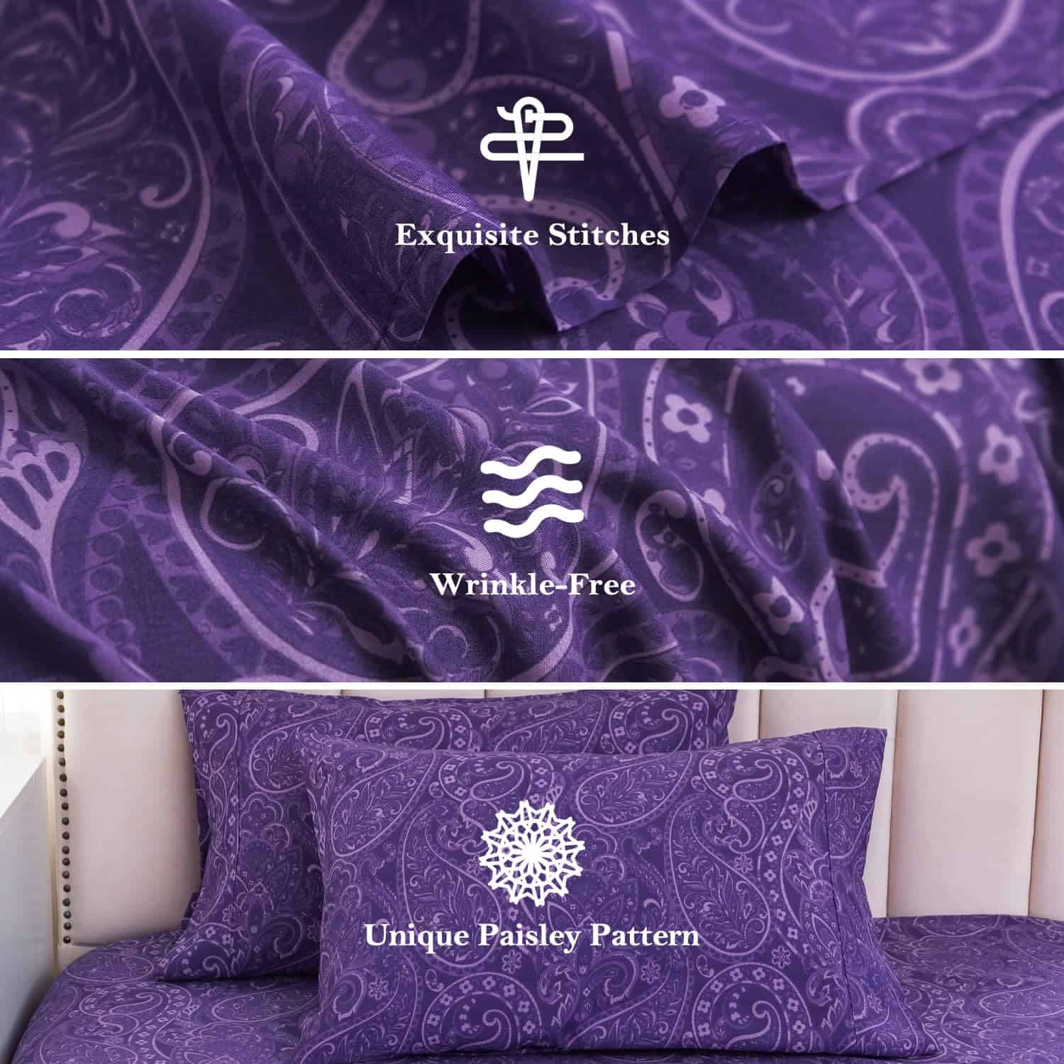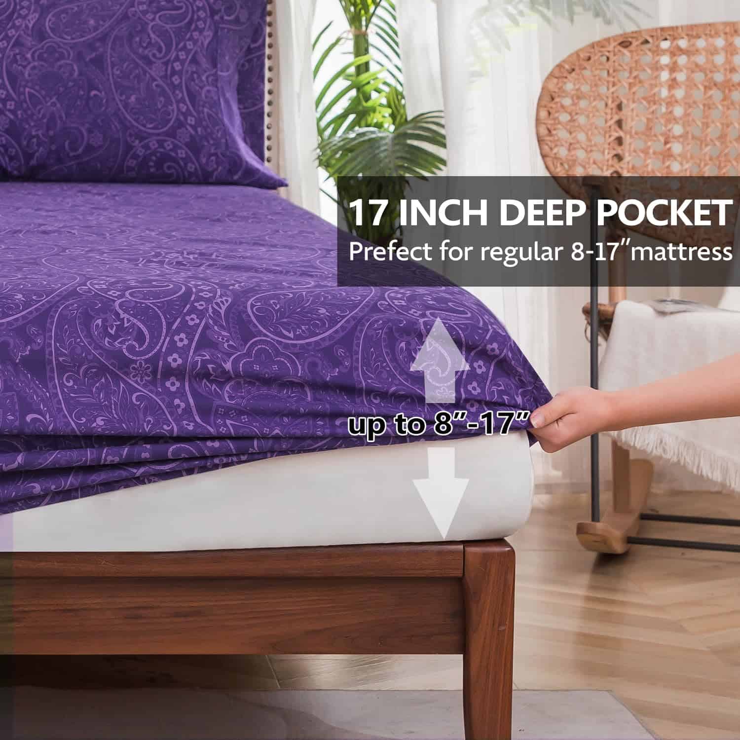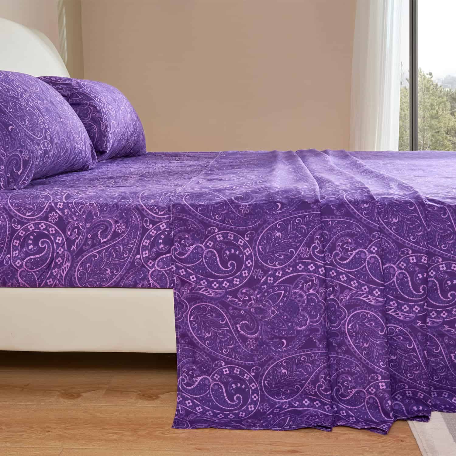 La sábana ajustable es adecuada para colchones con bolsillo muy profundo de hasta 16 pulgadas y elástica en 360 grados, por lo que puede estirarse, NUNCA se rasga ni se desliza. Nuestras sábanas de lujo son lavables a máquina con agua fría y se secan rápidamente en la secadora. Por favor, dile adiós a las sábanas sólidas aburridas y decora tu dormitorio con estas hermosas y únicas sábanas estampadas de flores paisley. Sets de 4 piezas para cama King Size moradas paisley incluyen: (1) sábana plana: 108″ x 102″, (1) sábana bajera: 78″ x 80″, (2) fundas de almohada: 20″ x 40″. El suave y cálido set de ropa de cama de 4 piezas lavable con estampado paisley morado es ideal para Navidad. Conjunto de ropa de cama con sábana plana, sábana ajustable, funda de almohada. Será un gran regalo de Navidad o cumpleaños para niños, niñas, hombres y mujeres, mamás y papás. Es una buena elección para la decoración del hogar.