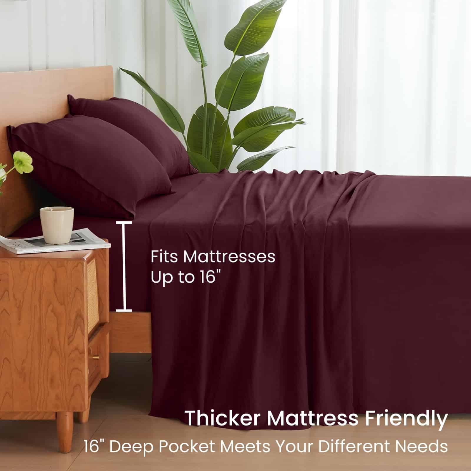 4. JUEGO DE SÁBANAS KING DE BOLSILLO PROFUNDO – Este juego de sábanas tamaño king incluye 1 sábana plana (108 x 102 ), 1 sábana ajustable (78 x 80 ), y 2 fundas de almohada king (20 x 36 ). Los bolsillos profundos de 16″ se ajustarán a la mayoría de los colchones, incluidos aquellos combinados con toppers. El dobladillo de 8″ de profundidad de las fundas de almohada mantendrá tus almohadas en su lugar, ¡nunca se deslizarán!.