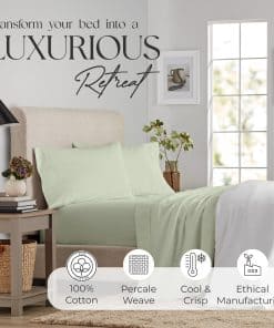 1. Lujo y comodidad se unen: Tejidas con las mejores fibras 100% algodón, nuestras sábanas te mantienen acogedor durante toda la noche. El proceso especial de acabado realza el brillo y suavidad de la tela, convirtiéndolas en una adición perfecta a cualquier dormitorio. 2. Confort y sueño mejorados: Con un clásico tejido de percal, nuestras acogedoras sábanas y fundas de almohada son frescas, nítidas y suaves al tacto, para que nunca pierdas ni un instante de sueño. Se suavizan después de cada lavado, volviéndose más acogedoras día tras día. Perfectas para camas king. 3. ¿Qué incluye el set?: Nuestro juego de sábanas king incluye 1 sábana plana (108 pulgadas de ancho x 102 pulgadas de largo), 1 sábana ajustable (78 pulgadas de ancho x 80 pulgadas de largo) y 2 fundas de almohada tamaño king (40 pulgadas de ancho x 20 pulgadas de largo) para adaptarse mejor a tus necesidades. 4. Ajuste perfecto para tu colchón: Nuestra sábana ajustable cuenta con la tecnología de ajuste True Grip patentada con un elástico de caja de 1 pulgada en los bordes y elástico de -pulgada en la caída, proporcionando un ajuste ceñido para colchones de diferentes profundidades. También presenta una «Etiqueta inteligente de cabeza/pie» para facilitar la identificación de los lados. Ideal para juegos de cama king. 5. Instrucciones de cuidado de lavado: Nuestras sábanas refrescantes, fabricadas con un tejido de percal, son conocidas por su notable durabilidad y excepcional comodidad. Son convenientemente lavables a máquina, manteniendo su color y volviéndose más suaves con cada lavado. Sin embargo, para evitar arrugas, retira rápidamente las sábanas y fundas de almohada de la secadora o planchalas. Ropa de cama fácil de cuidar para estilos de vida ocupados. 6. La familia SUPREME ELEGANCE que incluye Purity Home está fabricada con materiales premium y sostenibles para una experiencia de vida refinada y respetuosa con el medio ambiente.