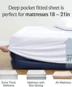 2. COMODIDAD INIGUALABLE: da la bienvenida a un juego de sábanas de tamaño king certificado según el estándar Oeko-Tex 100 que compite con las sábanas de lujo de hotel y alto conteo de hilos. Nuestros juegos de ropa de cama ofrecen las mejores sábanas de enfriamiento con una transpirabilidad superior. Además, las sábanas con bolsillos profundos de 18 pulgadas no se arrugan y son suaves y sedosas, brindándote un confort inigualable.