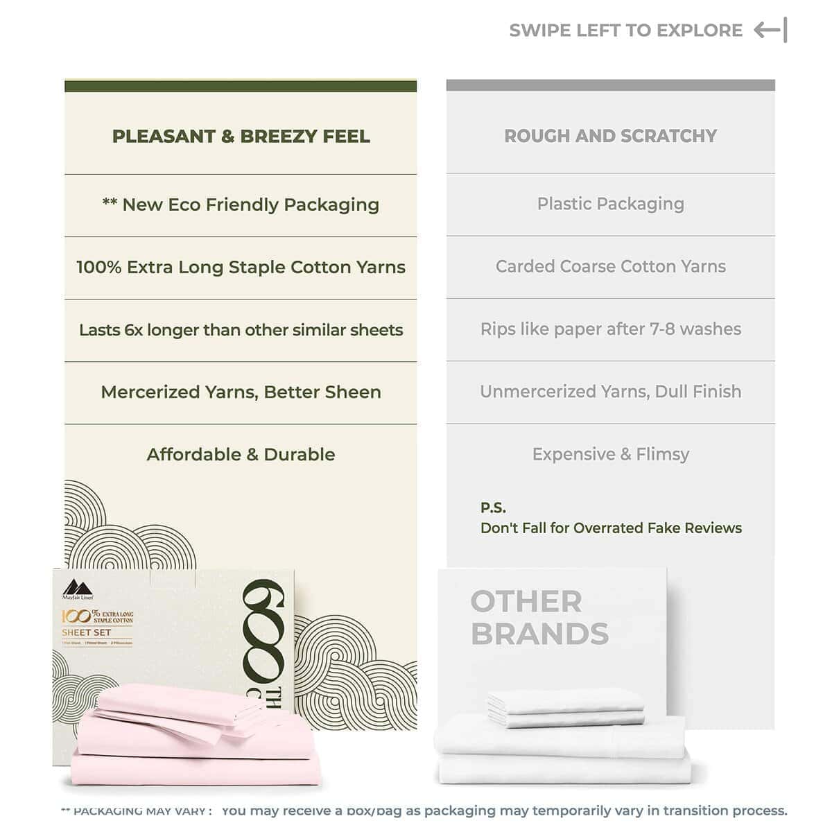 2. Hechas a medida para tu colchón de bolsillo profundo: nuestras sábanas ajustadas están meticulosamente elaboradas para adaptarse a colchones de bolsillo profundo de hasta 18 pulgadas. Un elástico en todo el contorno garantiza un ajuste ceñido que permanece en su lugar durante toda la noche. Este juego incluye una sábana plana que mide 108» de ancho x 106» de largo, dos sábanas ajustadas de 39» de ancho x 80» de largo + 16 pulgadas de bolsillo profundo y dos fundas de almohada de tamaño king cada una de 21» de ancho x 41» de largo. 3. Elegancia duradera con algodón mercerizado: No nos conformamos con menos. Nuestras sábanas se mercerizan para aumentar su resistencia, solidez del color y resistencia al pilling. Disfruta de ropa de cama que permanece vibrante y suave lavado tras lavado, sin preocuparte por que se decolore, encoja o haga bolitas. Simplemente saca las sábanas de la secadora de inmediato para minimizar las arrugas y mantener su aspecto prístino. 4. Elaborado con conciencia para la seguridad y calidad: Cada hilo de nuestras sábanas se obtiene cuidadosamente, utilizando algodón cosechado sin sustancias dañinas. Con una certificación de STANDARD 100 de OEKO-TEX, nuestra ropa de cama cumple con rigurosos estándares de seguridad. Vamos más allá al empaquetar nuestros productos en materiales totalmente libres de plástico, asegurando que cada elemento esté elaborado con cuidado y responsabilidad. 5. Se siente como una experiencia de hotel de cinco estrellas: Imagina la comodidad aterciopelada y sedosa de una cama de hotel de cinco estrellas. Con un tejido de satén, nuestras sábanas ofrecen ese exquisito, fresco y suave tacto, haciendo que cada noche se sienta como una escapada de lujo. Los cierres abiertos en nuestras fundas de almohada las hacen fáciles de manejar, asegurando que tus almohadas se deslicen suavemente y permanezcan cómodamente en su lugar toda la noche. Nuestra dedicación a la calidad garantiza que cada juego de sábanas cumpla con los rigurosos estándares esperados en los mejores hoteles.