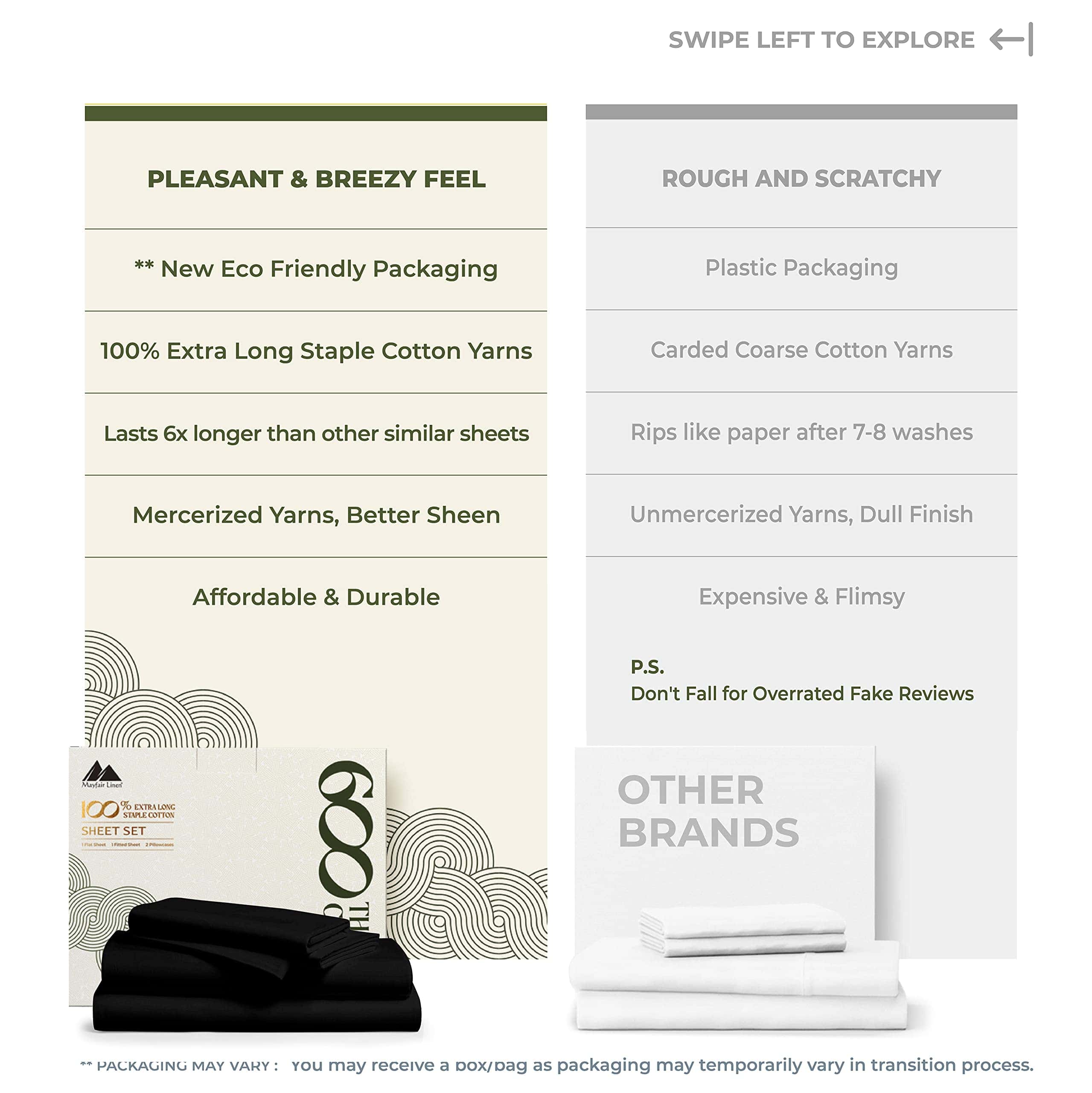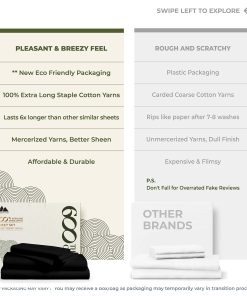 ¿QUÉ HAY EN LA BOLSA 1 Sábana plana – 108» de ancho x 106» de largo | 2 Sábanas de abajo – 39» de ancho x 80» de largo + 16» de bolsillo profundo | 2 Fundas de almohada tamaño king – 21» de ancho x 40» de largo QUÉ HACE QUE NUESTRAS SÁBANAS SEAN LAS MÁS SUAVES Y LUXURIOSAS EN EL MERCADO HOY: Cuanto más larga sea la fibra, más suave será la tela. Utilizamos fibras de algodón de fibra extra larga para hacer los juegos de sábanas más suaves y acogedores. 600 hilos se tejen en cada pulgada cuadrada de tejido para mejorar la resistencia, resistencia al pilling y al encogimiento, y la suavidad del tejido. Luego, las sábanas se mercerizan para darles un toque más suave, un brillo aumentado, y para que los colores parezcan más brillantes que las sábanas de algodón normales. ¿SON COMPARABLES A LA ROPA DE CAMA DE UN HOTEL DE CINCO ESTRELLAS: Sí. El tejido satén proporciona un tacto suave y sedoso que se siente similar a la textura de las sábanas de cama de un hotel de cinco estrellas. Estas sábanas de algodón son suaves, frescas y transpirables, como las que descansa en un hotel de cinco estrellas. ¿SON ESTAS SÁBANAS MÁS DURADERAS QUE OTRAS SÁBANAS DE ALGODÓN: Se podría decir que sí. Las sábanas hechas de algodón de fibra extra larga tienden a deshilacharse menos, formar menos bolitas, arrugarse menos para durar más que otras sábanas de algodón, sábanas de microfibra y sábanas de poliéster. ¿CÓMO HACEMOS SÁBANAS QUE SE AJUSTEN PERFECTAMENTE A SU CAMA: Cada sábana de abajo tiene elástico completo y bolsillos profundos para adaptarse a todos los colchones de hasta 18 pulgadas de profundidad. Etiquetas inteligentes indican el lado de la longitud y la anchura para que pueda hacer la cama fácilmente. Verá, hicimos todo el trabajo aquí para que usted no tenga que hacerlo. POR QUÉ 1M+ CLIENTES NOS CONFIAN: Cada paso de nuestro proceso es sostenible y ético para todos. Eso significa que nuestro juego de sábanas de algodón crece naturalmente, sin sintéticos ni OMG. Estamos certificados por ESTÁNDAR 100 por OEKO-TEX, lo que significa que nuestra ropa de cama está libre de sustancias dañinas y tintes textiles. Por último, todo nuestro embalaje es libre de plástico, lo que nos convierte en una opción amigable y sostenible.