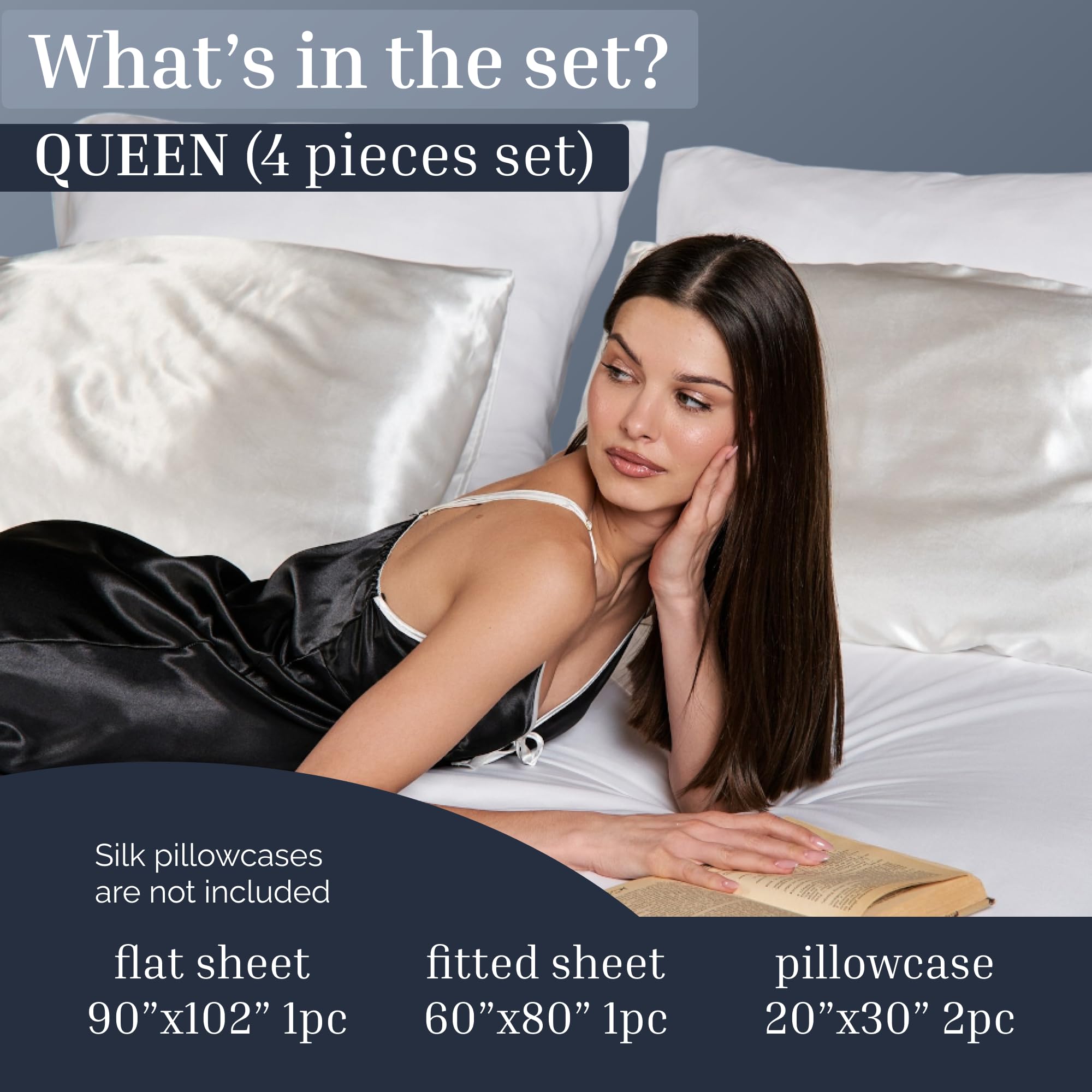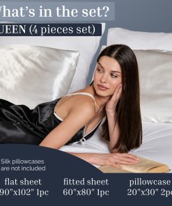Incluye 1 sábana plana (90″ x 102″), 1 sábana ajustable de bolsillo profundo (60″ x 80″), y 2 fundas de almohada (20″ x 30″), perfecto para cualquier colchón tamaño queen.