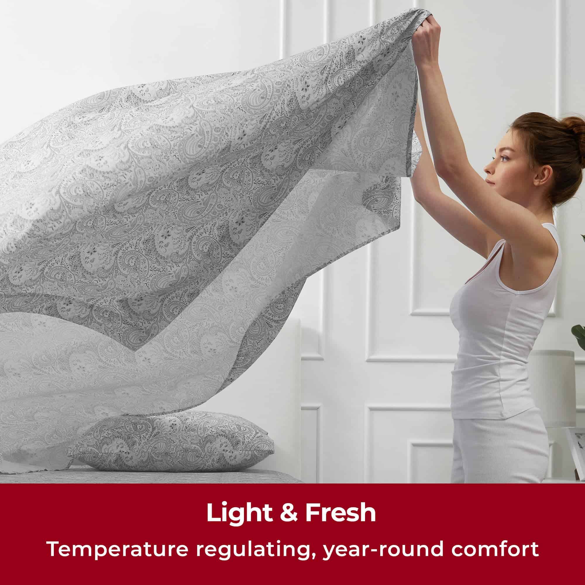 1. Lujo ligero para confort durante todo el año – Diseñadas para ser aireadas y ultra-ligeras, nuestras sábanas ofrecen un confort sin esfuerzo en cada temporada. Su construcción delgada y transpirable mejora el flujo de aire, absorbe la humedad y se seca rápidamente. A pesar de su sensación ligera, estas sábanas son excepcionalmente fuertes y más duraderas que el algodón, resistiendo manchas, desgarros y desgaste por lavados frecuentes. Perfecto para hogares ocupados con niños o mascotas.