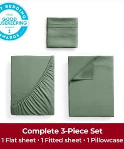 2. Juego Completo de Ropa de Cama de 3 Piezas Twin – Incluye 1 Sábana Ajustable (39″x75″x16″), 1 Sábana Plana (66″x96″), y 1 Funda de Almohada (20″x30″) – todas elaboradas en microfibra cepillada doble para una sensación ultra suave. Regulación de temperatura para mantenerte acogedor en invierno y fresco en verano.