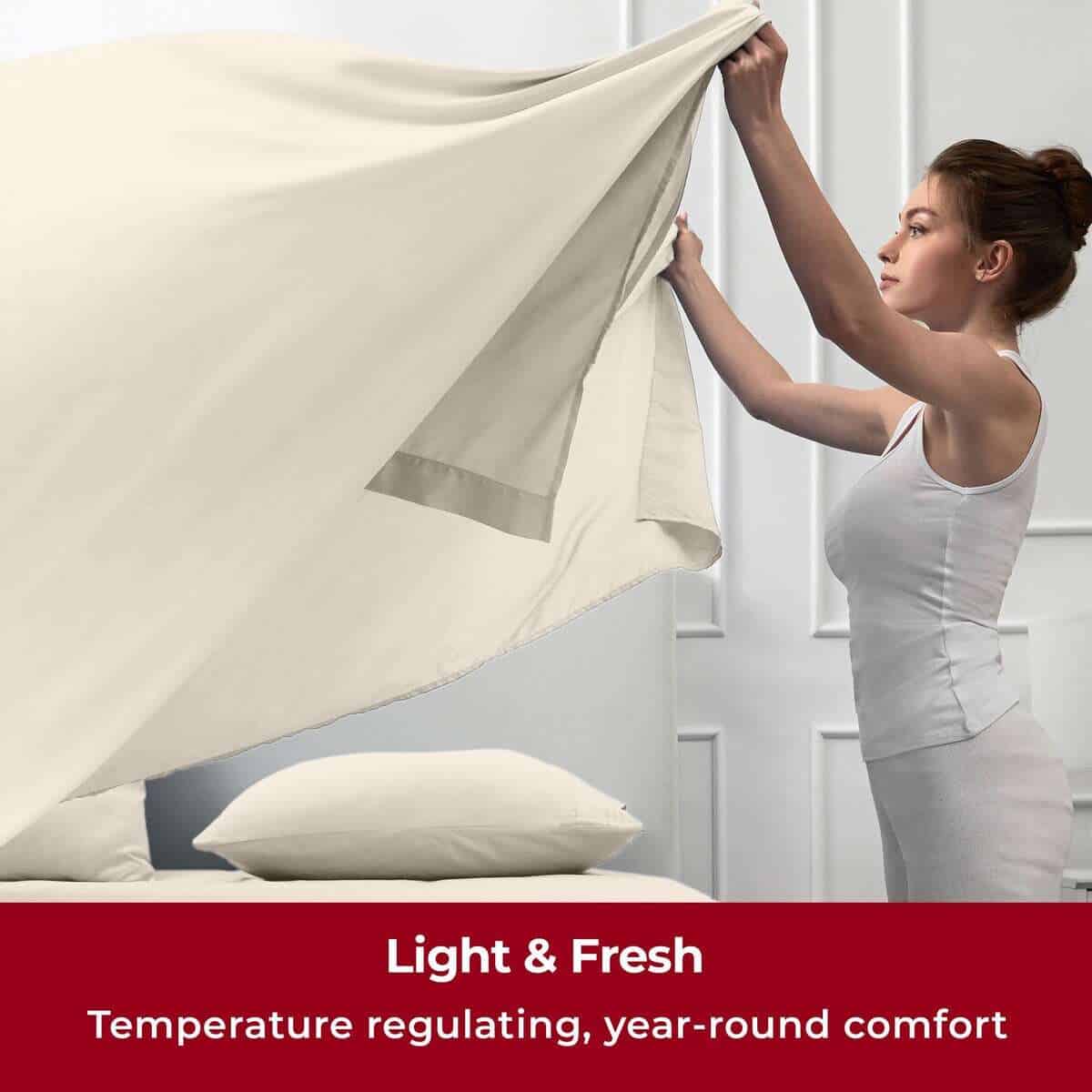 1. Lujo ligero para mayor comodidad durante todo el año: Diseñadas para ser aireadas y ultraligeras, nuestras sábanas ofrecen comodidad sin esfuerzo en todas las estaciones. Su construcción delgada y transpirable mejora el flujo de aire, absorbe la humedad y se seca rápidamente. A pesar de su sensación ligera, estas sábanas son excepcionalmente fuertes y más duraderas que el algodón, resistiendo manchas, rasgaduras y desgaste por lavados frecuentes. Perfecto para hogares ocupados con niños o mascotas.