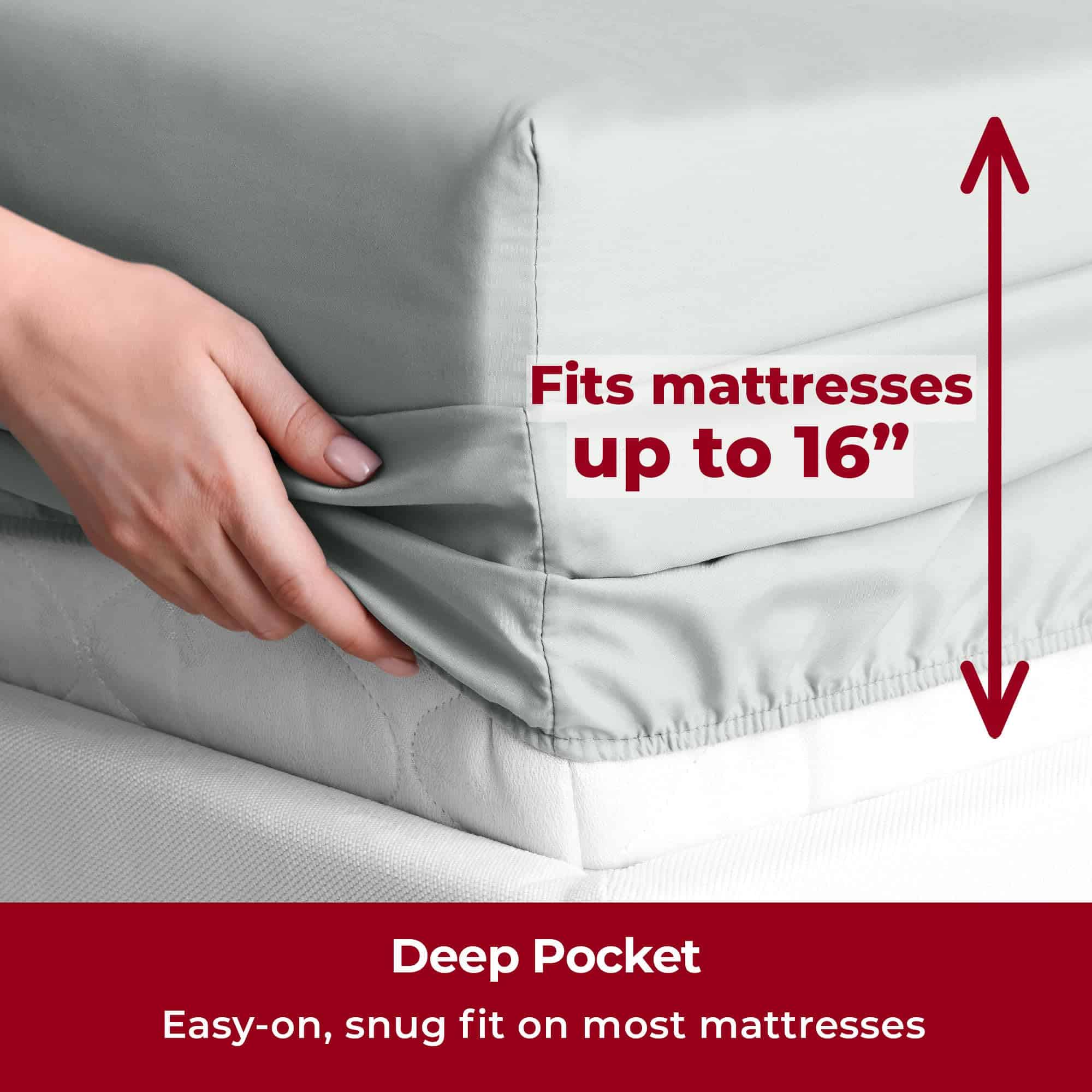 – Ajuste perfecto y certificado seguro – Bolsillos profundos se ajustan a colchones de hasta 16″ de profundidad, haciéndolos ideales para toppers de espuma viscoelástica, colchones de aire, y más. Una banda elástica cosida asegura un ajuste ceñido y seguro. Certificado OEKO-TEX(R) STANDARD 100 (22.HUS.40981, Hohenstein), probado para más de 1,000 sustancias nocivas para su tranquilidad.