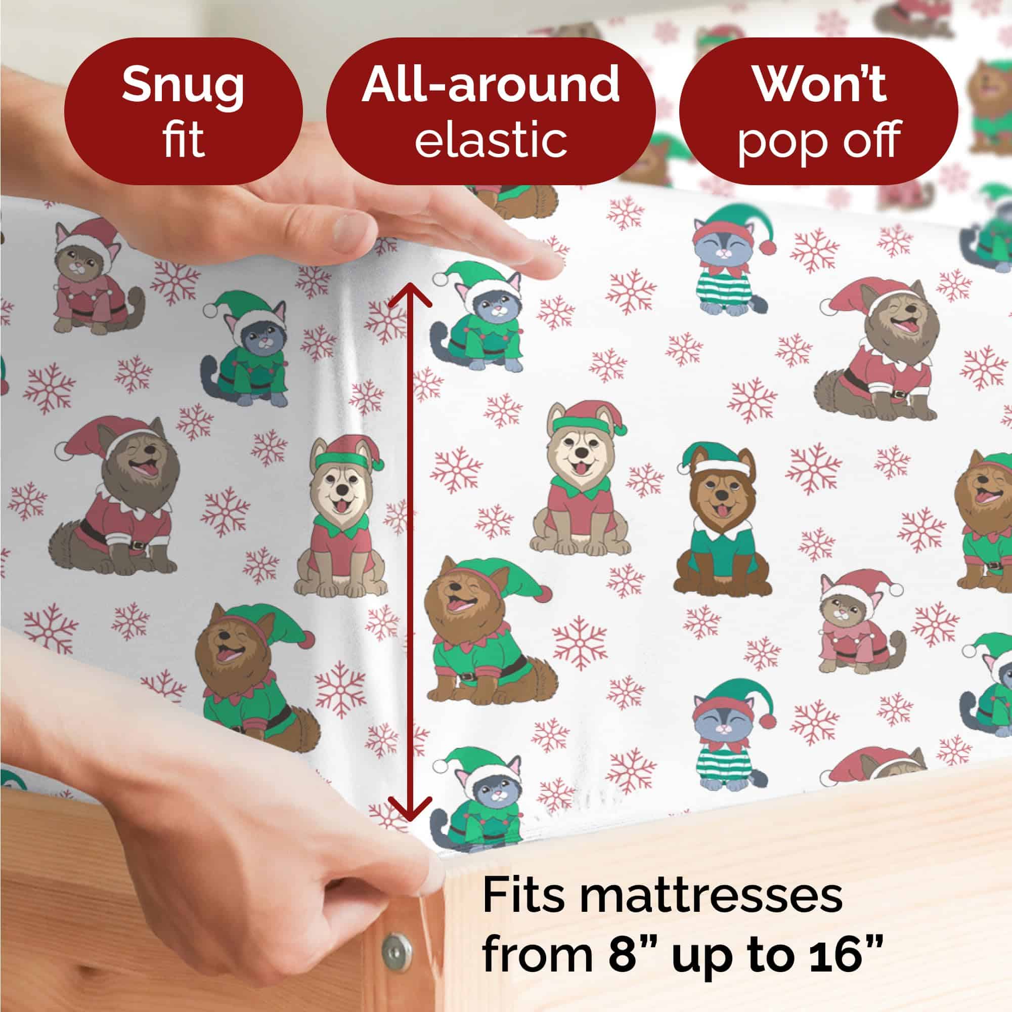 1. ¡Tenga una temporada navideña alegre con nuestro juego de sábanas festivas de 3 piezas! 1 funda de almohada, 1 sábana plana y 1 sábana ajustable. Sábana plana (96 x 66) Sábana ajustable (75 x 38) 1 funda de almohada (20 x 30).