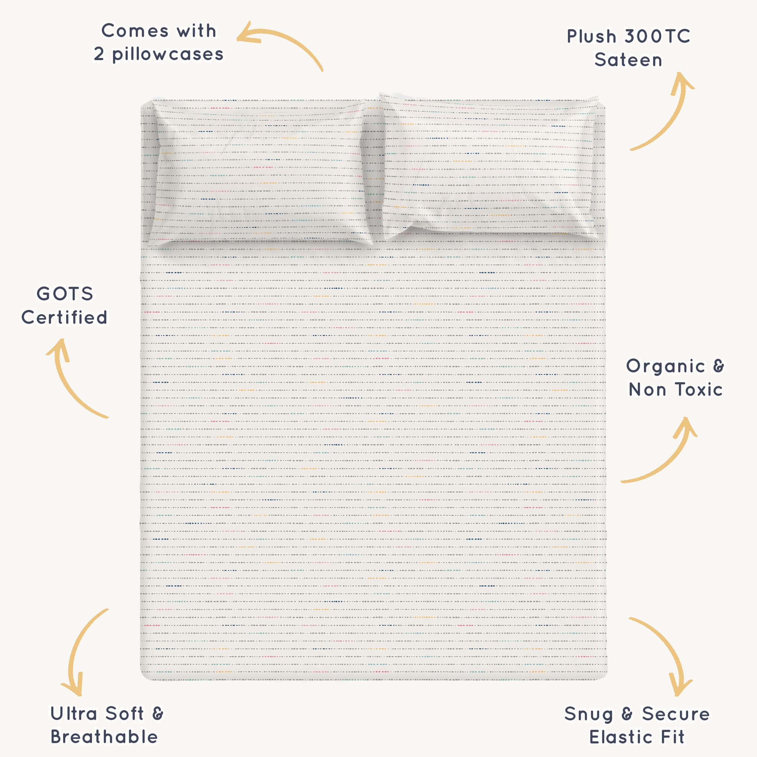 1. EL PAQUETE PERFECTO DE 4 – Nuestro Juego de Sábanas Queen incluye 1x Sábana Plana – 90 X 102 + 1 x Sábana Bajera – 60 X 80 + 17 (Bolsillo) Ideal para Colchones Tamaño Queen y 2 x Fundas de Almohada – 20 x 30 – Es suave como un sueño y para la comodidad de tu hijo durante toda la noche. Además, está certificado por GOTS, lo que significa que está tejido con los materiales más puros y libre de químicos y toxinas dañinas.