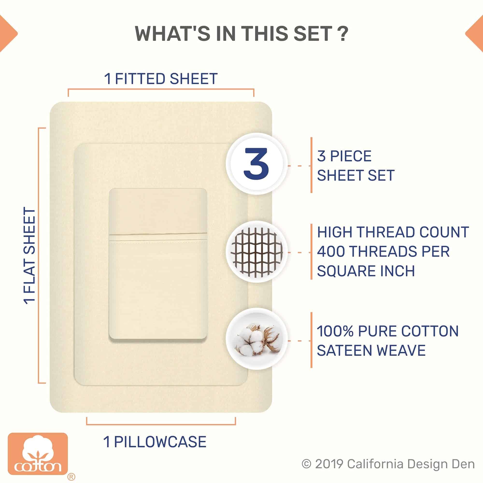 2. Perfectamente dimensionado con bolsillo profundo: Nuestro juego de sábanas de algodón individual de 3 piezas incluye 1 sábana superior, 1 sábana bajera con elástico en todos los bordes que se ajusta a colchones de 8 a 15 pulgadas de profundidad, y 1 funda de almohada de tamaño estándar. El elástico de alta calidad de estas sábanas blancas no se aflojará ni se amontonará, y los indicadores de lado de la cabeza/pie hacen que hacer la cama sea pan comido.