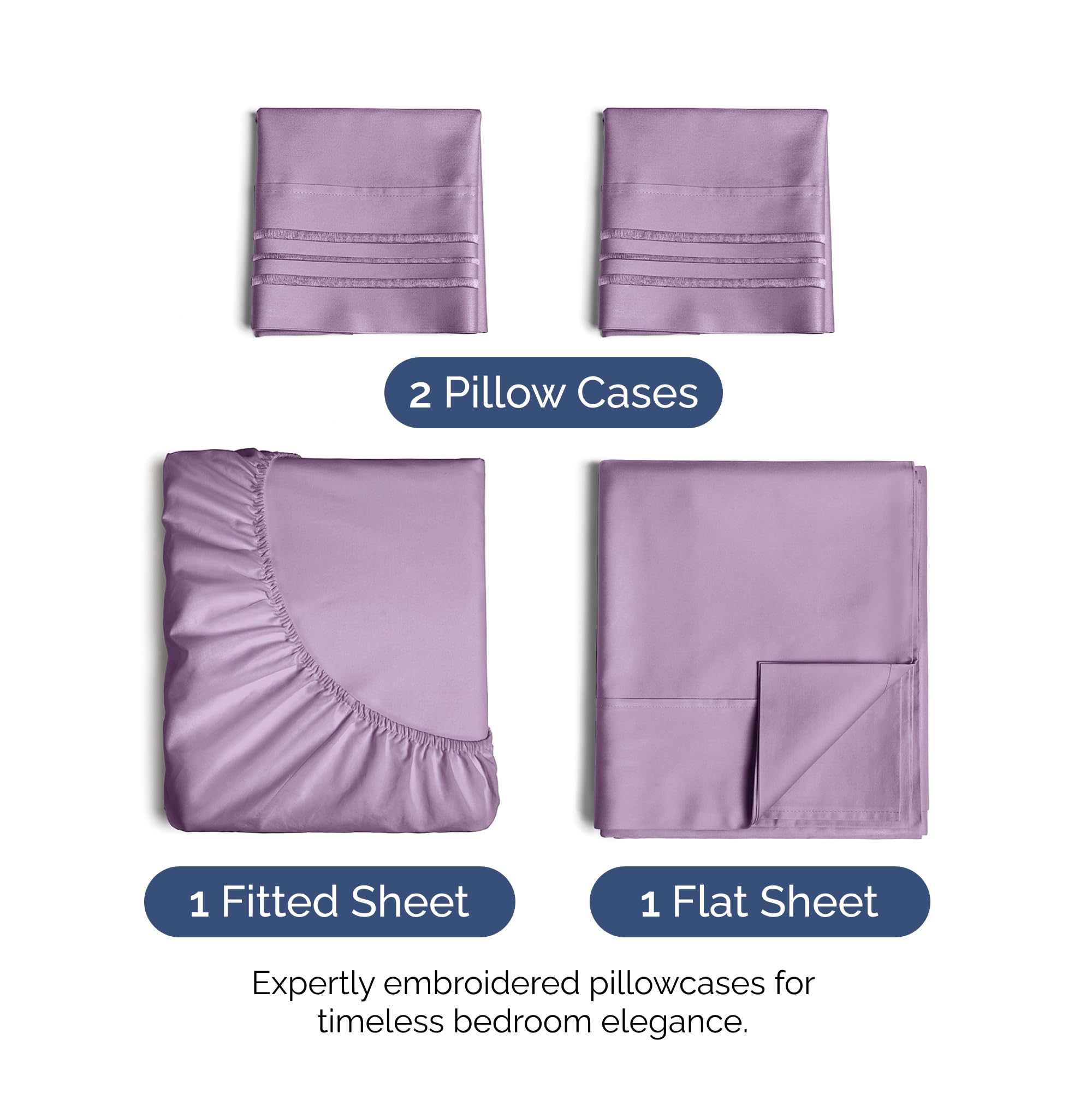 Conjunto de sábanas de 4 piezas para cama King Size en un hermoso color lila. Este juego incluye 2 fundas de almohada, una sábana plana y una sábana ajustable. La sábana plana tiene una medida de 108 pulgadas de ancho por 102 pulgadas de largo, la sábana ajustable tiene una medida de 84 pulgadas de ancho por 72 pulgadas de largo y las fundas de almohada miden 40 pulgadas de ancho por 20 pulgadas de largo.
